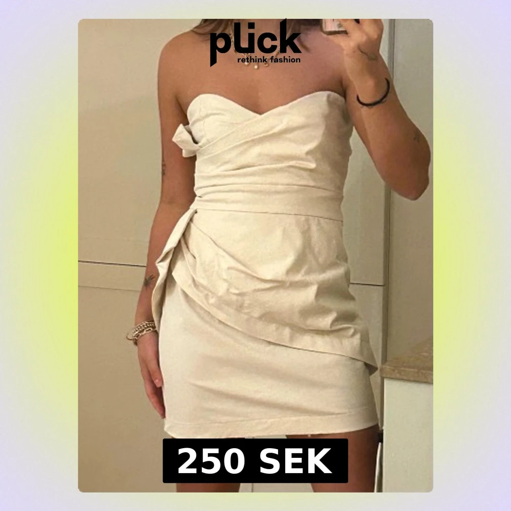 Säljer en snygg axelbandslös kortklänning i champagnefärg med omlott-detaljer och drapering framtill. Klänningen har en markerad midja och dragkedja bak för enkel påklädning.