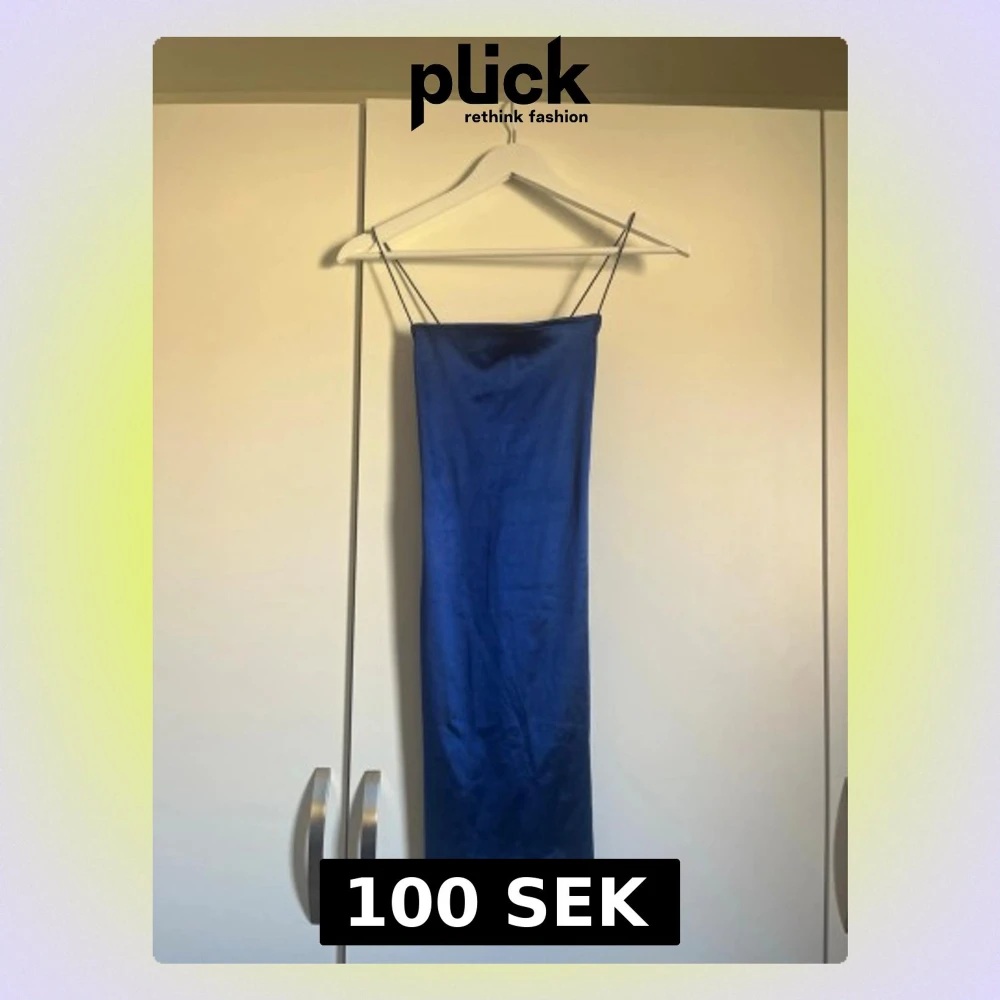 Säljer en stilren blå klänning i satin med tunna axelband och rak passform. Klänningen är kort och har en enkel, elegant design som ger en lyxig känsla. Perfekt för dig som gillar minimalistisk stil och vill ha något som sticker ut.