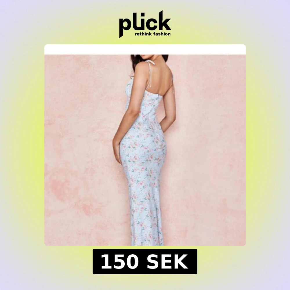Säljer en romantisk ljusblå långklänning med blommigt mönster och smala axelband som knyts upptill. Klänningen har en figurnära passform och söt detalj med liten rosett framtill. Perfekt för sommarens alla tillfällen!
