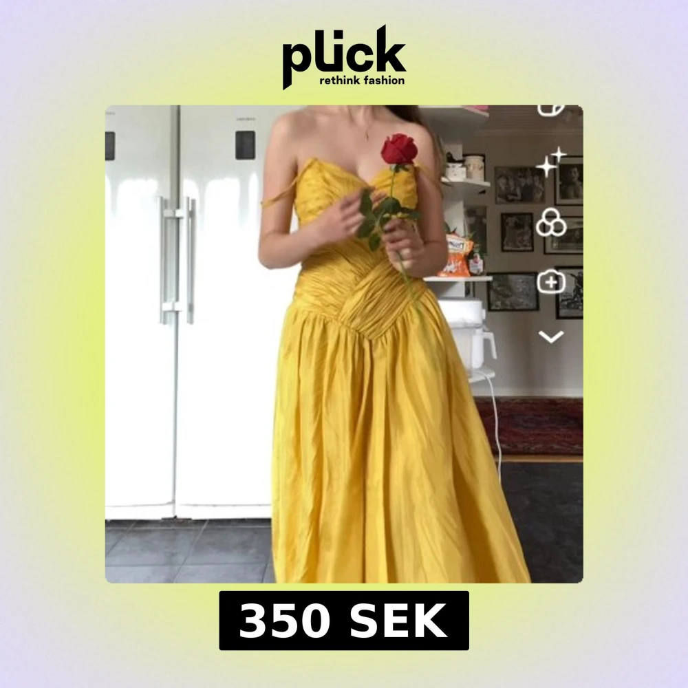 Säljer en solgul långklänning med smala axelband och vackert draperad överdel. Klänningen har markerad midja och ett svepande kjolparti som ger en elegant siluett. Perfekt för bal eller festliga tillfällen. Jag använde denna på spex när jag klädde ut mig till Belle i skönheten och odjuret