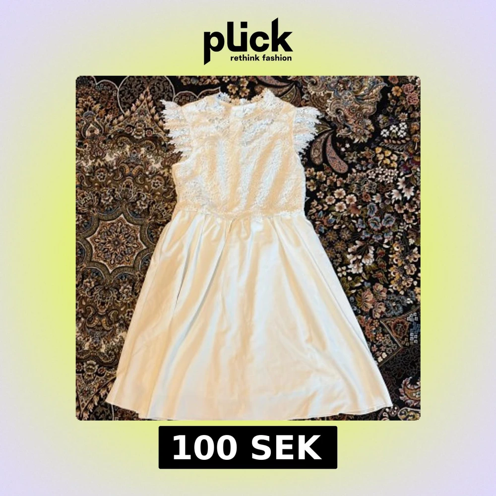 Superfin vit klänning med spets upptill och volangdetaljer vid axlarna. Klänningen har en rund halsringning och är ärmlös med vackert blommigt spetsmönster. Kjolen är slät och faller fint i en kort längd. Perfekt för somriga tillfällen!