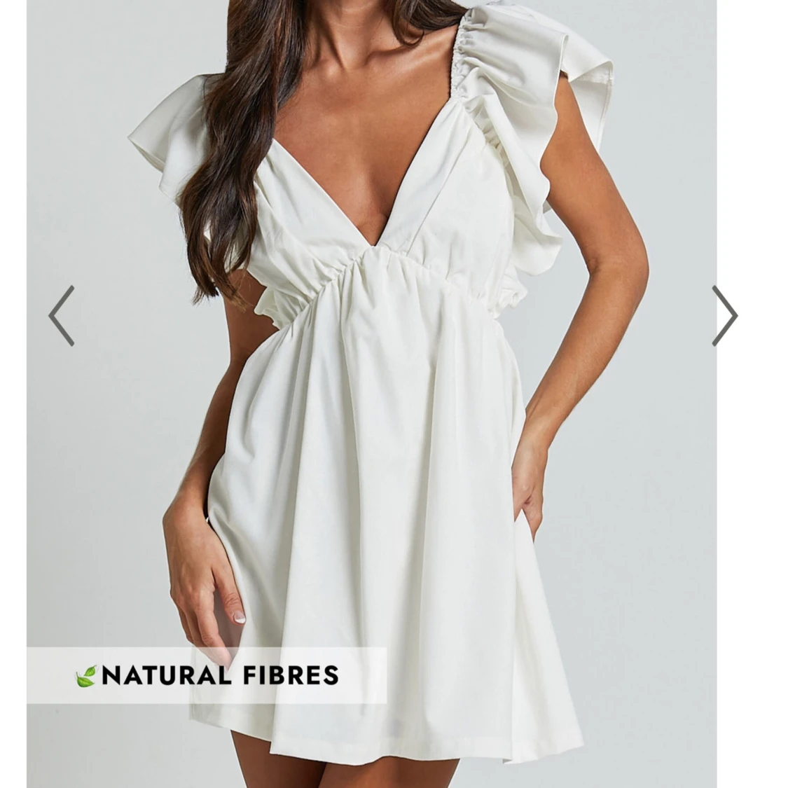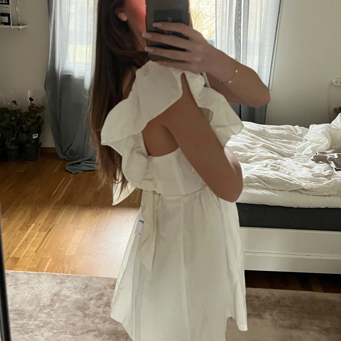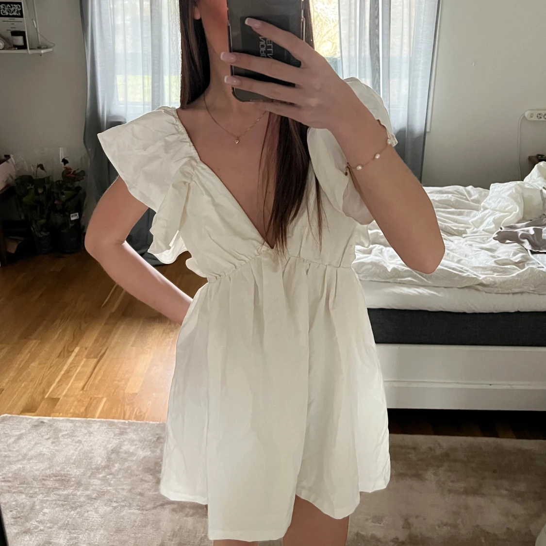 Säljer en söt vit klänning med volangdetaljer och v-ringning. Klänningen har en kort längd och är perfekt för varma dagar eller bla studenten.🤍Ej använd, endast provad. Nypris 650kr.