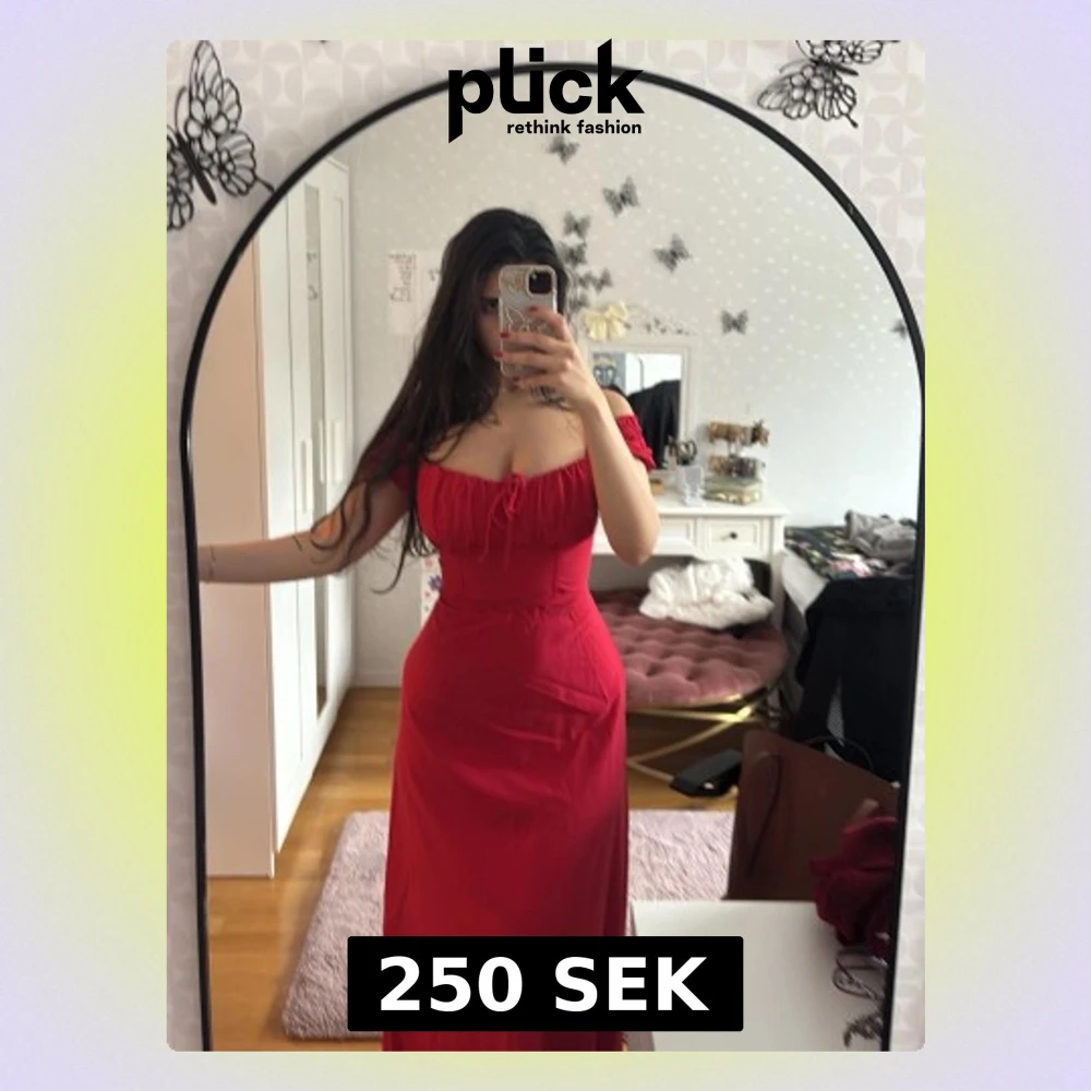 Säljer en röd långklänning med offshoulder och snörning vid bysten. Klänningen har en figurnära passform upptill och faller snyggt längs kroppen. Perfekt för dig som vill sticka ut med en färgstark look.