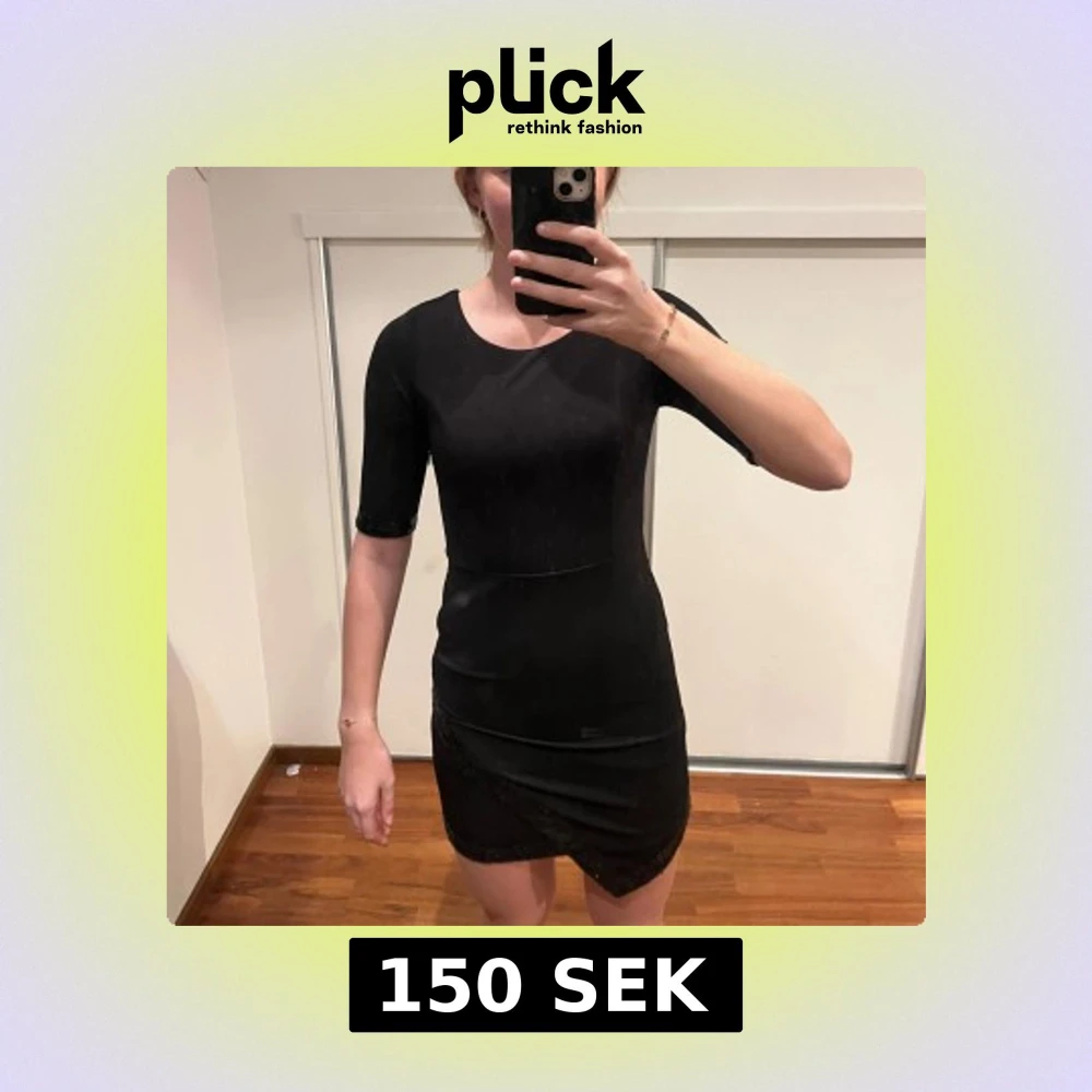 Snygg svart klänning med kort längd och paljettdetaljer längs fållen. Den har en tight passform och trekvartsärmar, perfekt för en kväll ute. Klänningen har en omlott-design som ger en elegant touch.