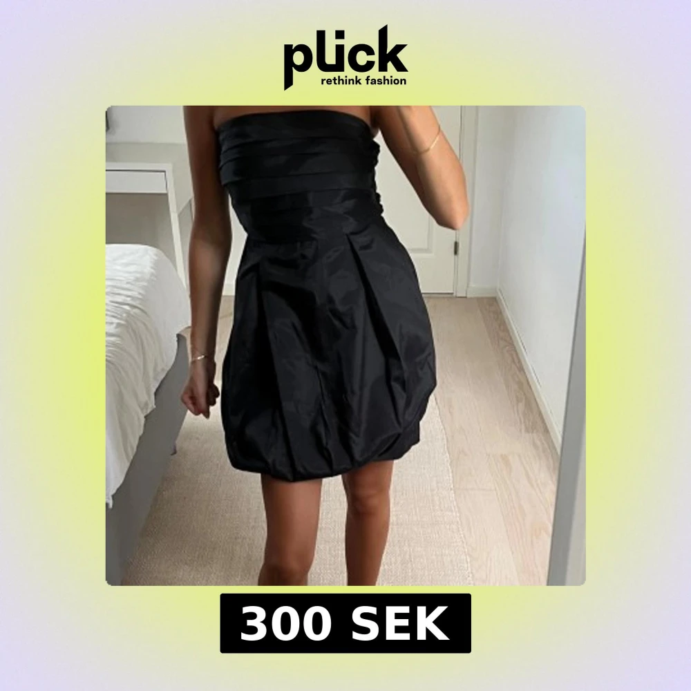 Supersnygg svart axelbandslös kortklänning med veckad överdel och ballongformad kjol. Klänningen har en elegant och stilren look, perfekt för dig som vill sticka ut. Materialet är glansigt och ger en lyxig känsla.