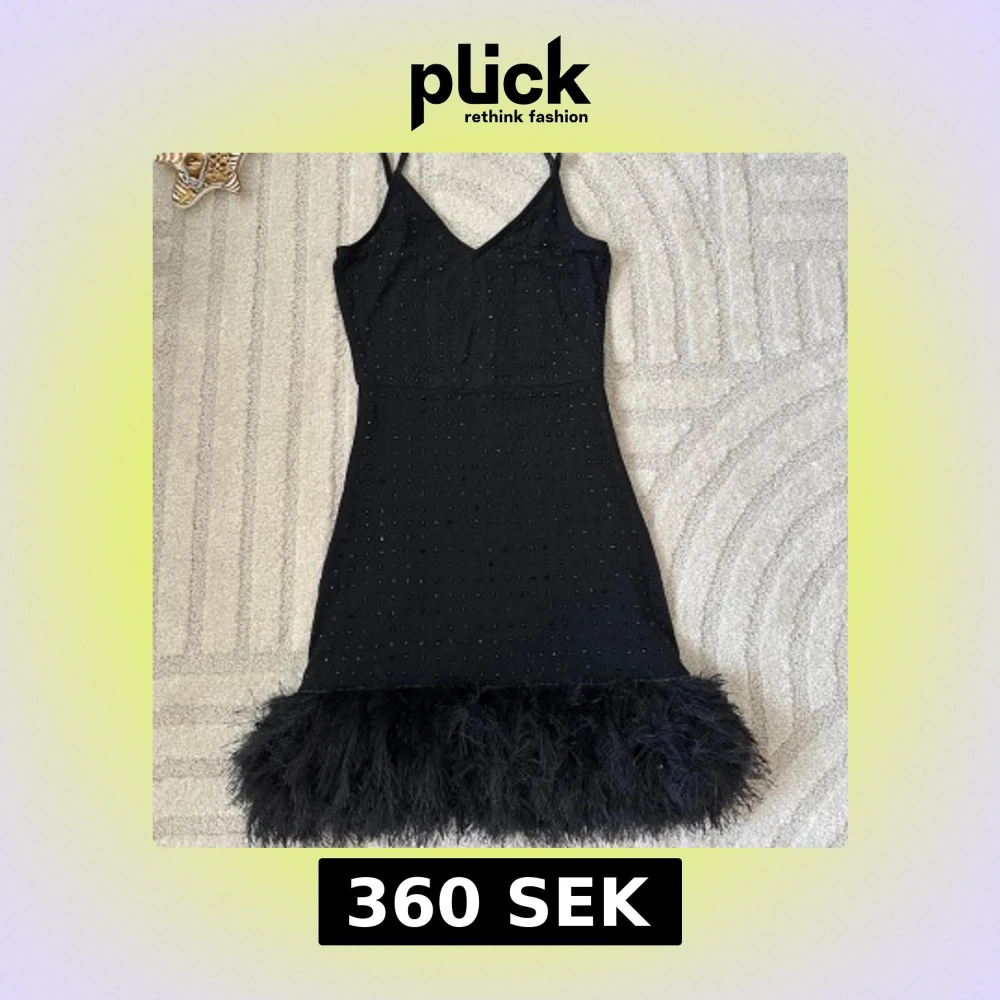 Supersnygg svart kort klänning med tunna axelband, små glittriga detaljer över hela tyget och en fluffig fjäderkant längst ner. Perfekt för dig som vill sticka ut och känna dig extra glam på nästa fest! Sitter figurnära och har en modern look.