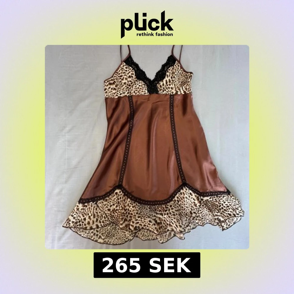 Snygg kort brun satinklänning med tunna axelband, leopardmönstrade partier upptill och nertill samt svarta spetsdetaljer. Klänningen har en lätt utställd form och känns både lyxig och lekfull. Perfekt för dig som gillar djurmönster och vill sticka ut.