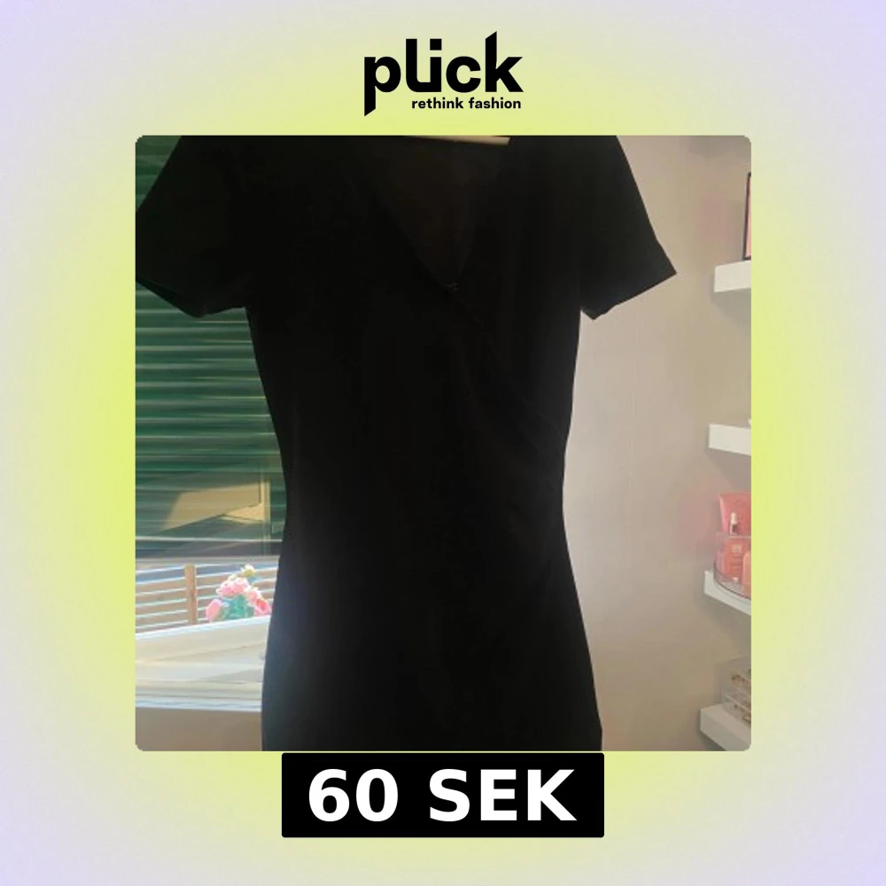 Säljer en svart omlottklänning med kort ärm och v-ringning. Klänningen har en figurnära passform och är perfekt för dig som gillar en stilren look. Enkel att styla med accessoarer för olika tillfällen.