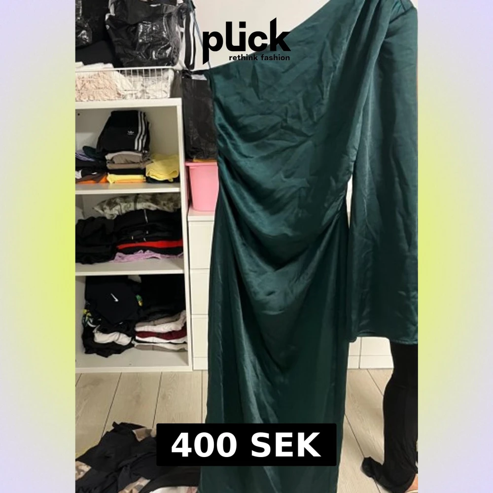 Säljer en elegant mörkgrön långklänning i glansigt material med oneshoulder och lång ärm. Klänningen har en snygg drapering och faller fint längs kroppen, perfekt för dig som vill sticka ut med en unik siluett.