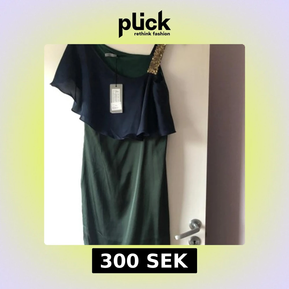 Elegant klänning i grön och marinblå med en glittrig axelrem. Den har en asymmetrisk design med volangdetaljer och är perfekt för festliga tillfällen.