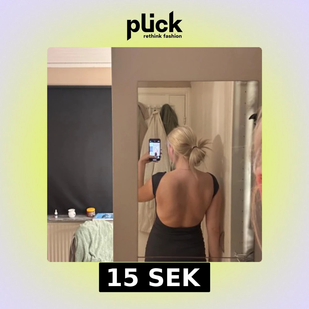 Säljer en svart långklänning med tight passform och öppen rygg. Klänningen har korta ärmar och en stilren, minimalistisk look. Perfekt för dig som vill ha en enkel men snygg outfit med lite edge.