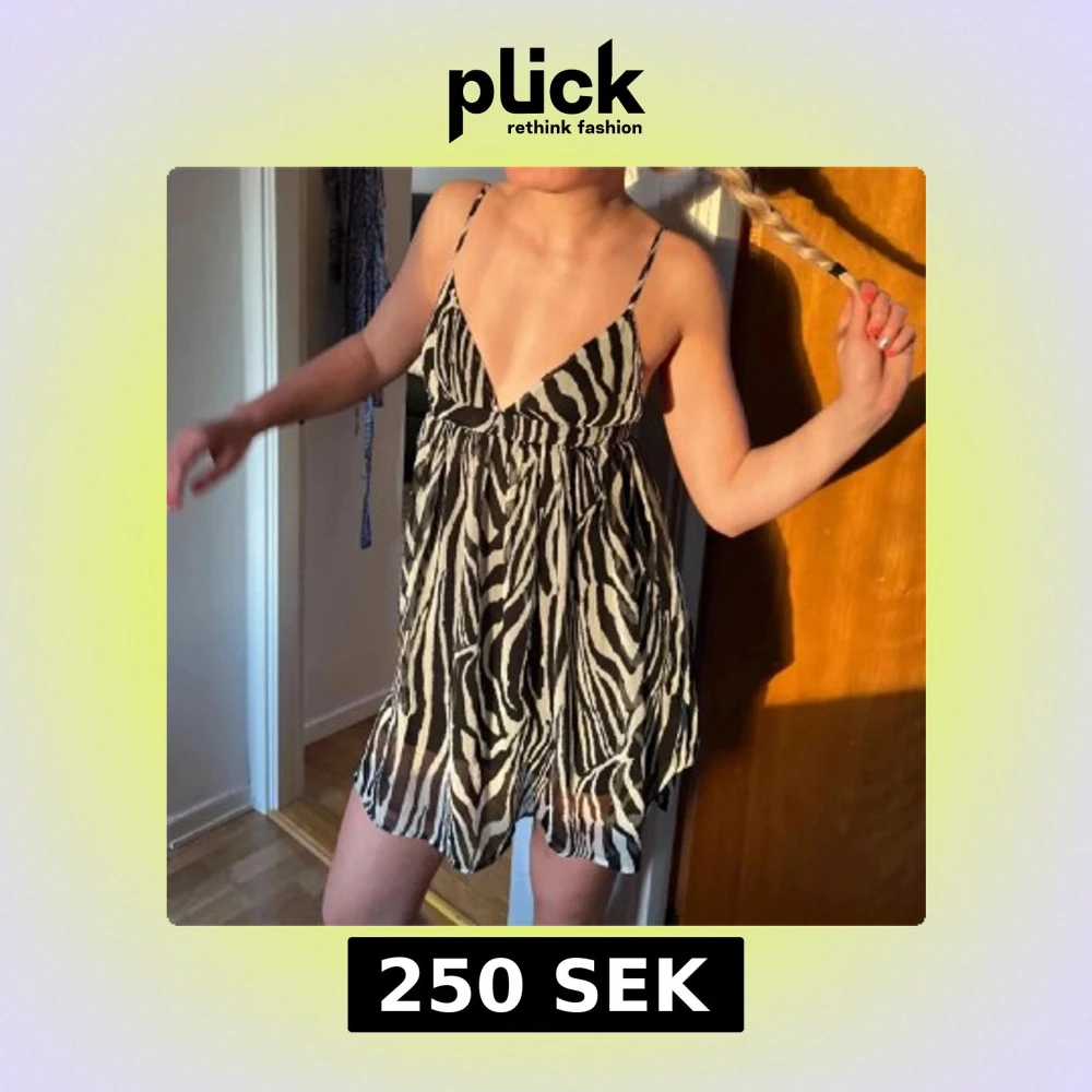 Supersöt kort klänning med zebramönster i svart och vitt. Djup v-ringning, tunna axelband och luftig passform. Perfekt för varma dagar och ger en trendig vibe. Materialet känns lätt och flowy.