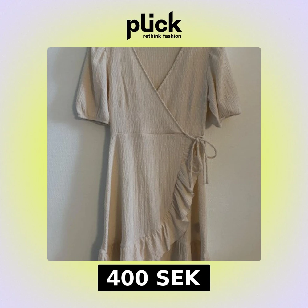 Säljer en beige omlottklänning med v-ringning och knytband i midjan. Klänningen har trekvartsärmar och en fin volangdetalj längs kanten. Perfekt till sommaren!☀️🩷(aldrig använd)