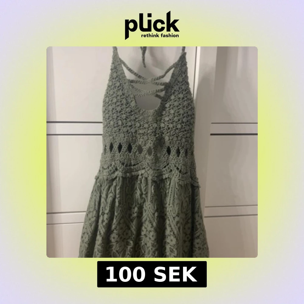 Supersöt grön klänning med virkad överdel och snygga knytband i ryggen. Klänningen har ärmlös design och mönstrad kjol i spetsliknande material. Perfekt för varma dagar och sommarhäng.