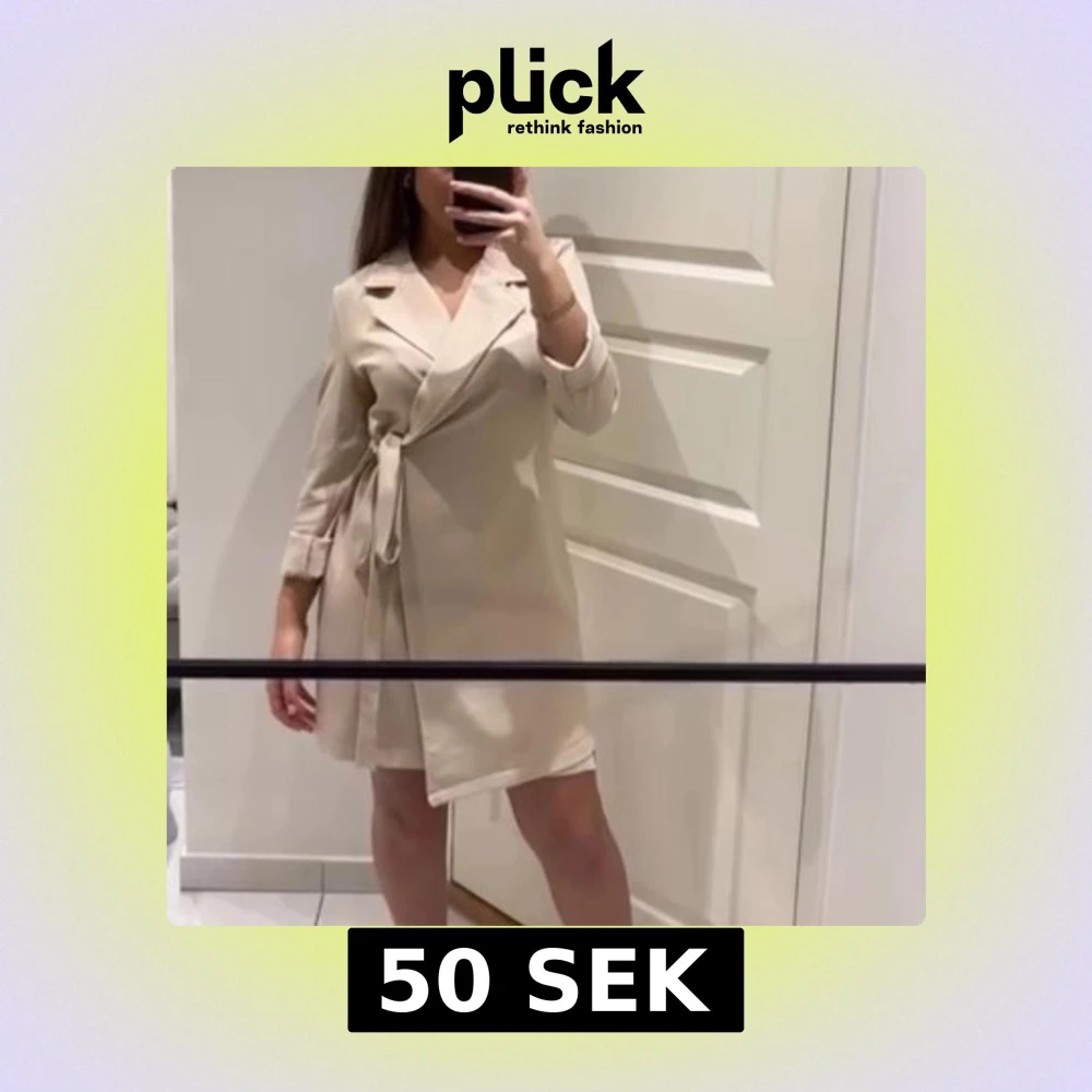 Säljer en stilren beige omlottklänning med knyt i midjan och v-ringad hals. Klänningen har lång ärm och en kort, asymmetrisk skärning som ger en modern vibe. Perfekt för dig som gillar minimalistisk och chic stil.