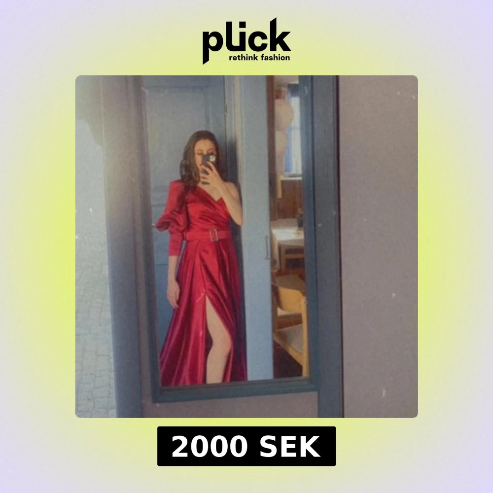 Elegant röd långklänning i satin med en axel och en dramatisk slits. Klänningen har ett bälte i midjan som framhäver figuren och ger en stilren look.