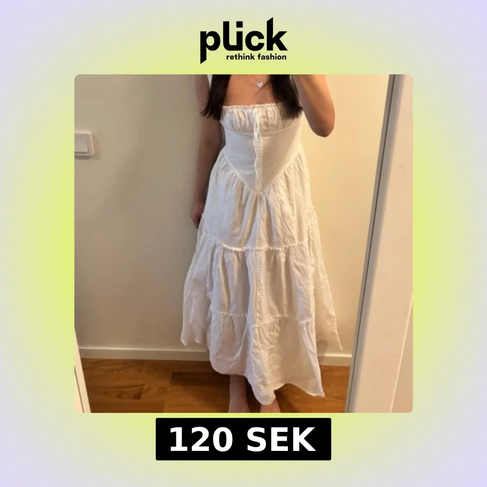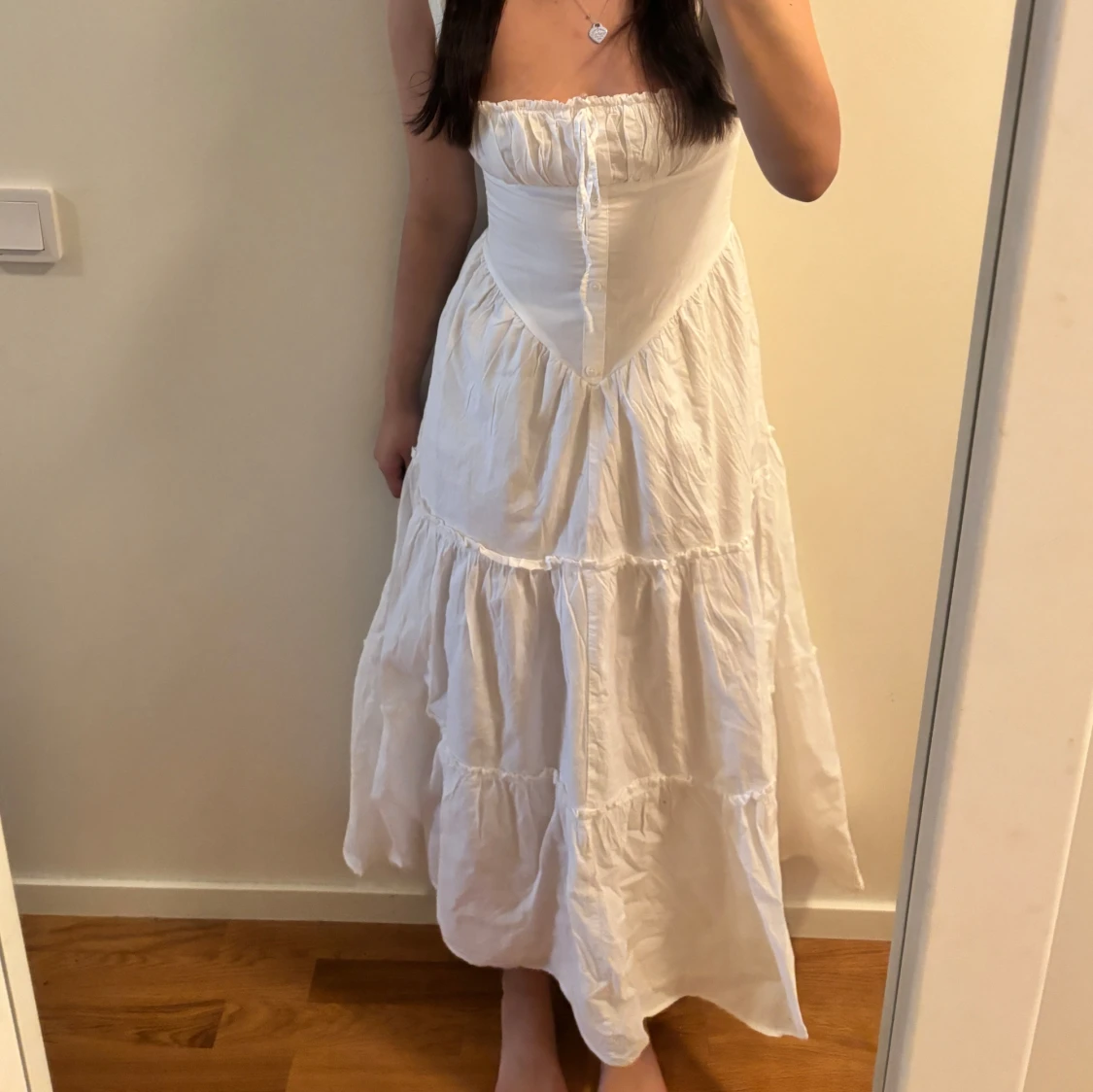 Superfin vit långklänning med smock upptill och volangig kjol. Klänningen är ärmlös och har en söt knytning vid bysten. Perfekt för sommarens alla tillfällen och ger en romantisk vibe.