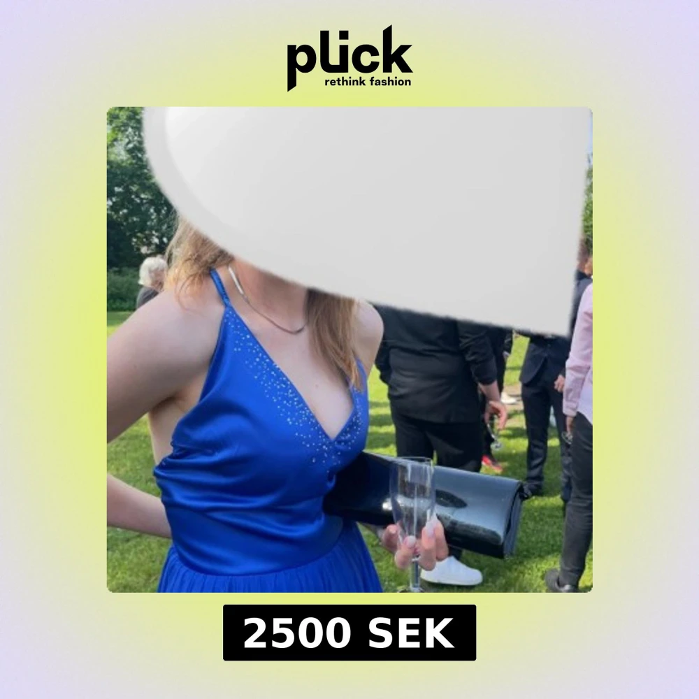 Elegant blå långklänning med öppen rygg och smala axelband. Klänningen har en v-ringad framsida och ett flödande kjolparti som ger en vacker siluett. Perfekt för speciella tillfällen. Andvänd en gång men i mycket fint sick. Den är special sydd efter mina mått och önskemål så väldigt unik.