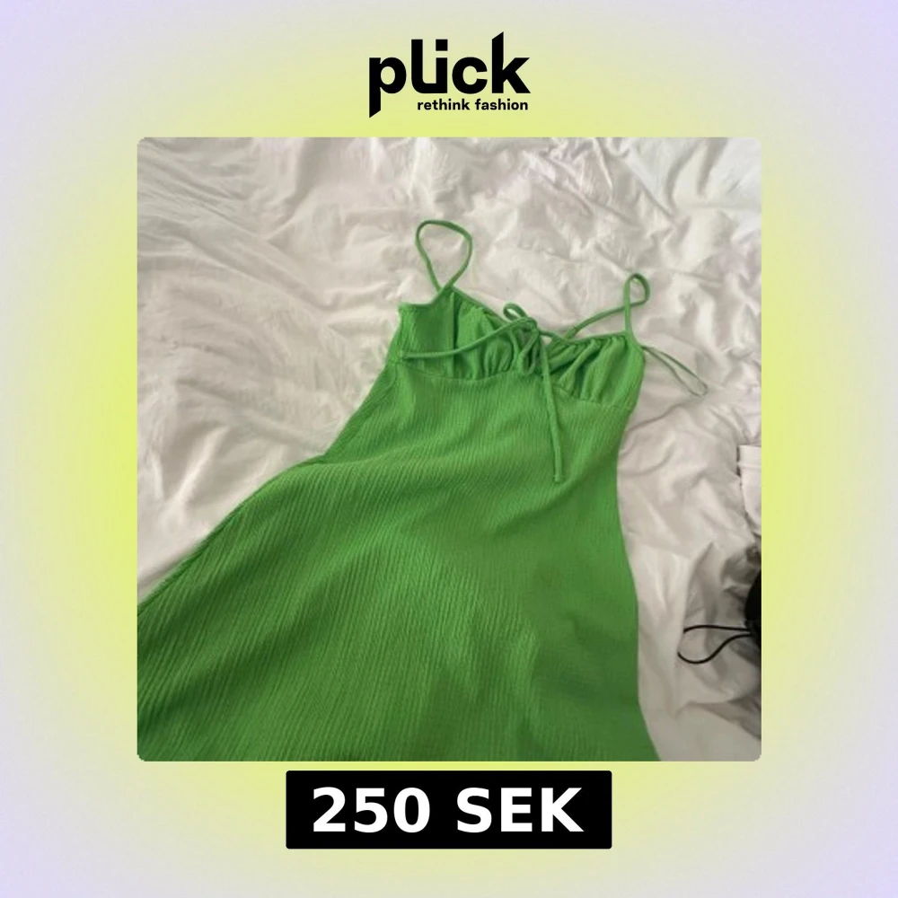 Säljer en snygg grön klänning med smala axelband och knytning framtill. Klänningen har en enkel och stilren design med lätt rynkad struktur i tyget. Perfekt för varma dagar!