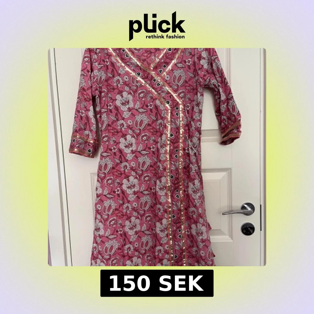 Säljer en rosa omlottklänning med blommigt mönster i vitt och svart. Klänningen har guldiga detaljer längs kanterna och trekvartsärm. Materialet är mjuk bomull och modellen är lite loose. Perfekt för dig som gillar färg och mönster!