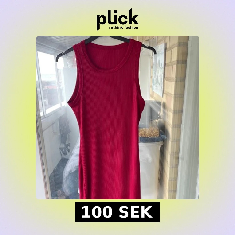 Ribbad röd klänning från SHEIN i storlek S. Ärmlös modell med rund halsringning och rak passform. Klänningen är knälång och tillverkad i mjukt, stretchigt material.