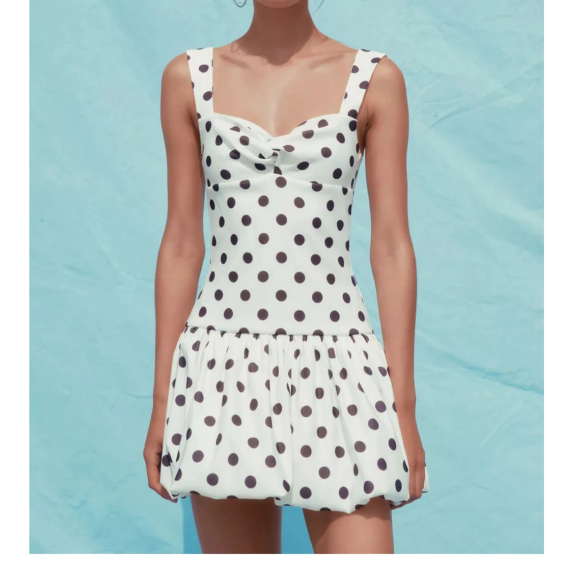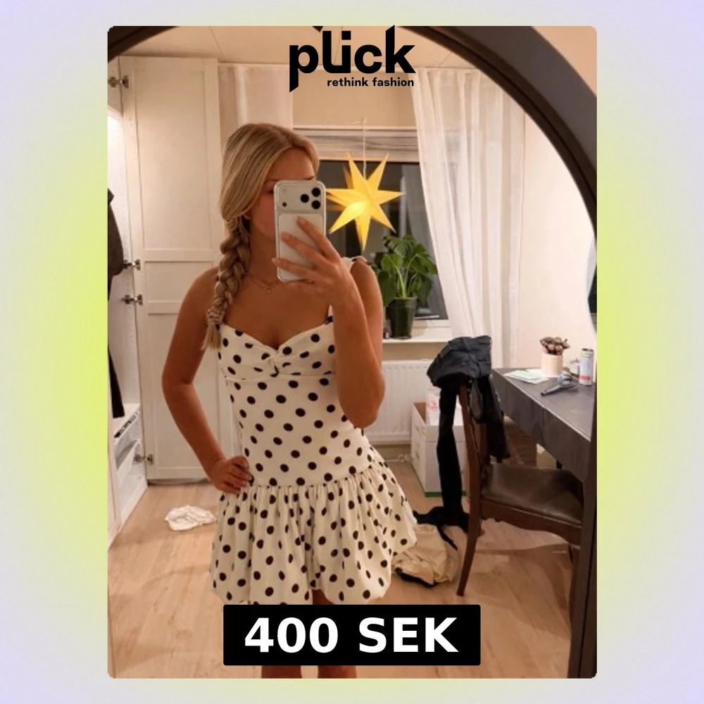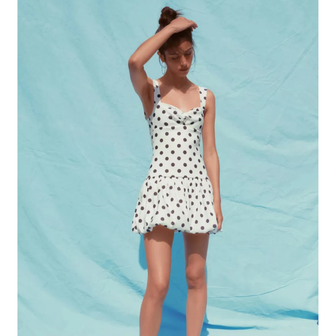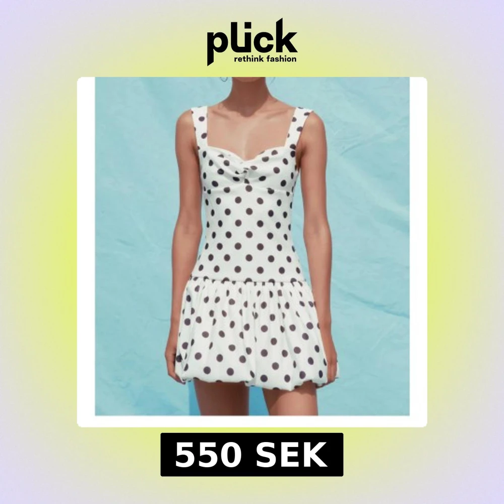 Supersöt vit kort klänning med svarta prickar och breda axelband. Fint skick!