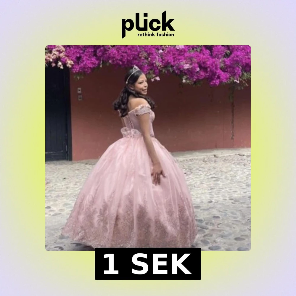 Drömmig långklänning i ljusrosa med offshoulder och voluminös kjol. Klänningen har vackra spetsdetaljer och blommor, samt markerad midja med rosett. Perfekt för bal eller quinceañera. Klänningen går och anpassa för storlek, och storleken på kjolens volym. Hyr klänningen. Skriv privat för mer information