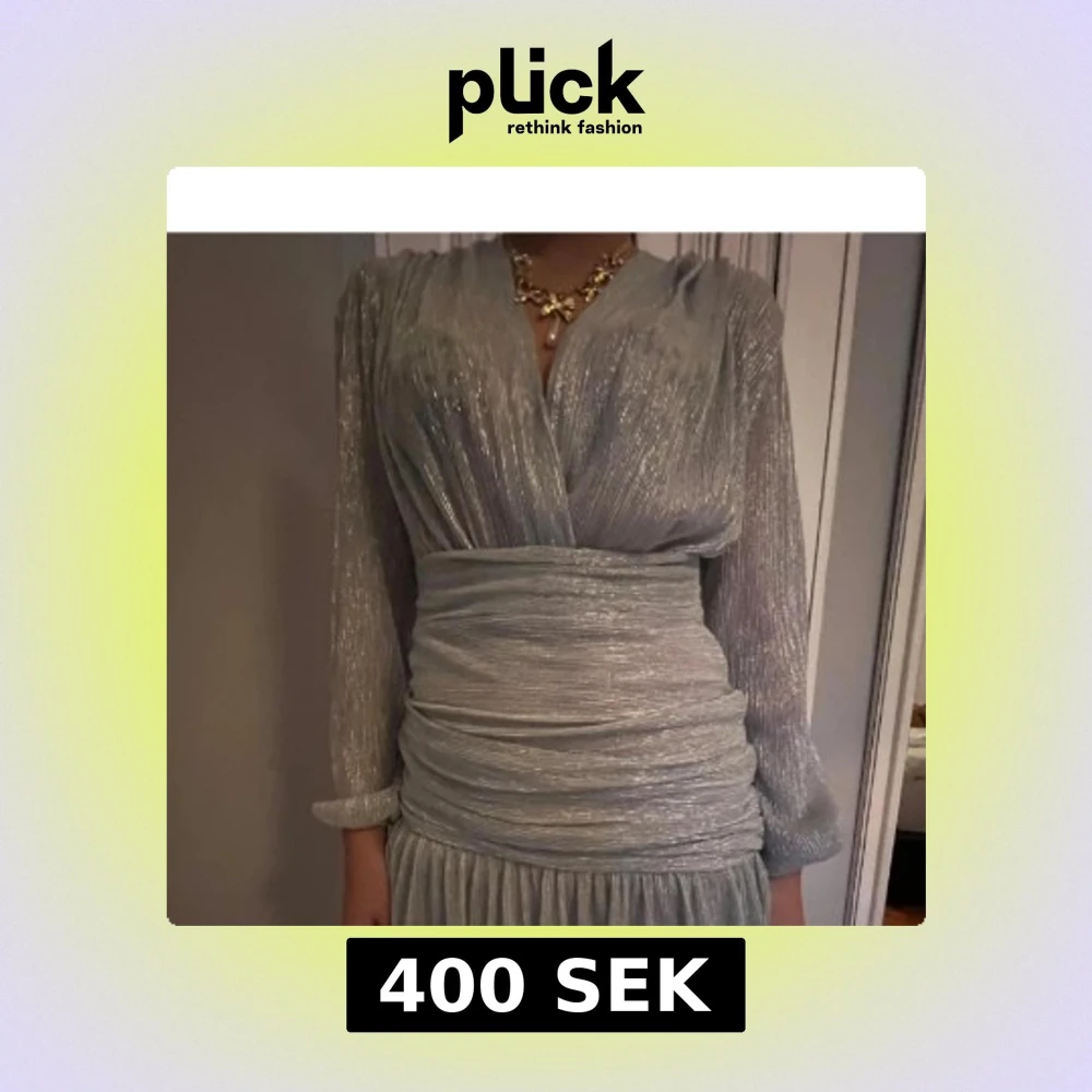 Säljer en glittrig silverfärgad kortklänning med omlott framtill och markerad midja. Klänningen har långa ärmar, v-ringning och plisserad kjol. Perfekt för dig som vill sticka ut med en elegant och trendig look.