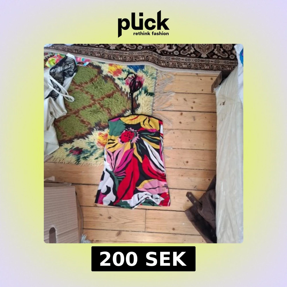 Säljer en axelbandslös klänning med stort blommigt mönster i rött, rosa, grönt, svart, vitt och gult. Klänningen har en figurnära passform och är perfekt för dig som vill sticka ut med färg och mönster.