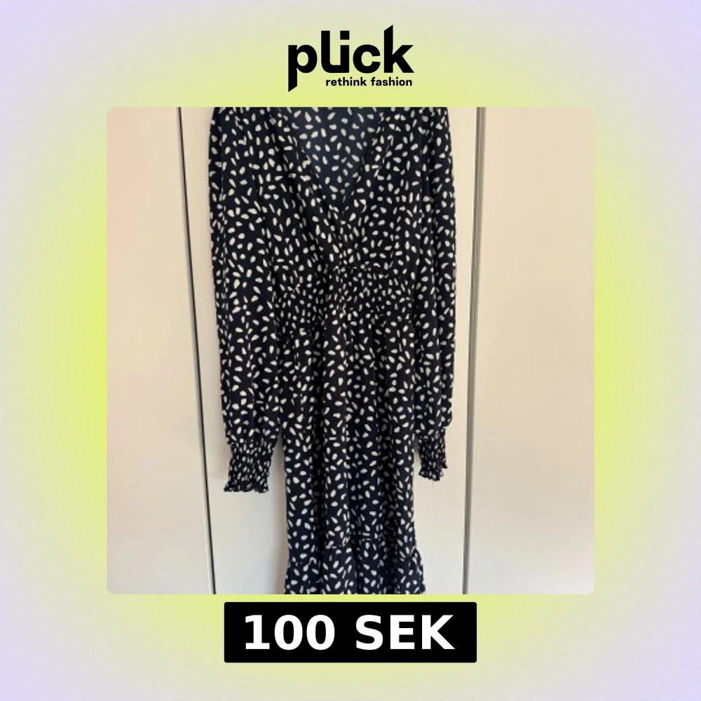 Snygg kortklänning i mörkblått med vita prickiga mönster. Klänningen har v-ringning, långa ärmar med smock vid handlederna och markerad midja med resår. Använd 1-2 gånger, är som ny!! Priset går att diskutera