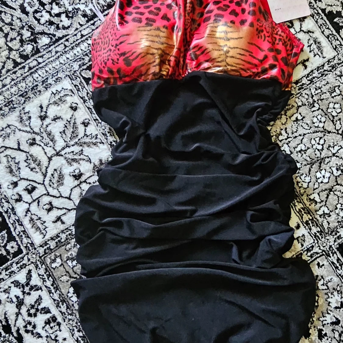 Säljer en snygg klänning med svart kjoldel och röd leopardmönstrad överdel. Klänningen har en åtsittande passform och är ärmlös, perfekt för dig som vill sticka ut.