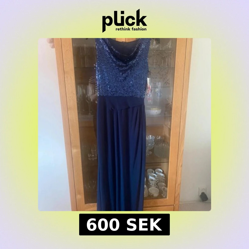 Snygg marinblå långklänning med glittrig paljettöverdel och draperad halsringning. Kjolen är i ett mjukt, fallande tyg och klänningen är ärmlös. Perfekt för bal eller fest där du vill sticka ut med extra glamour.