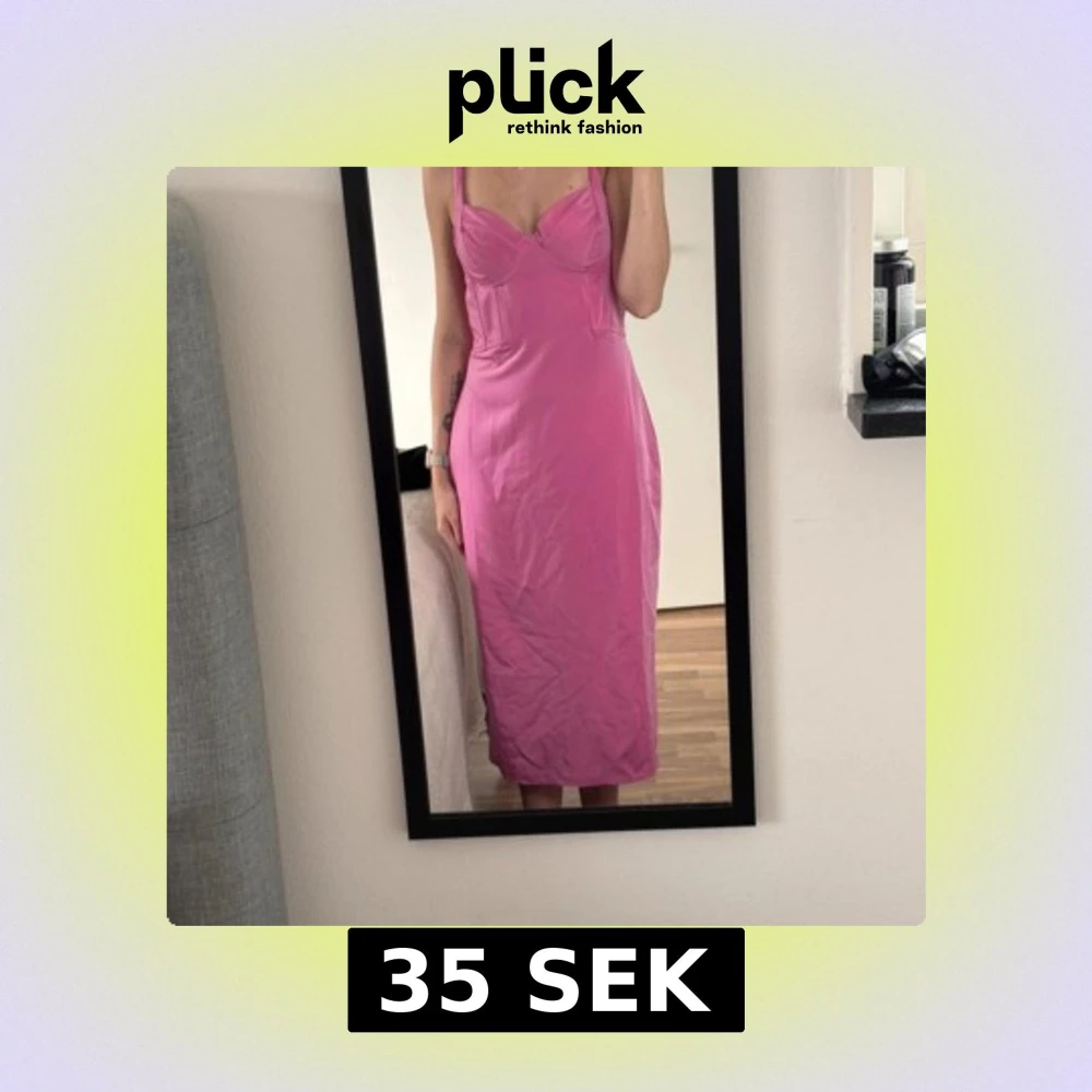 Säljer en snygg rosa långklänning med figurnära passform och breda axelband. Klänningen har markerade kupor och en slits baktill för extra rörelsefrihet. Materialet är mjukt och har en lätt glansig finish, perfekt för dig som vill sticka ut.