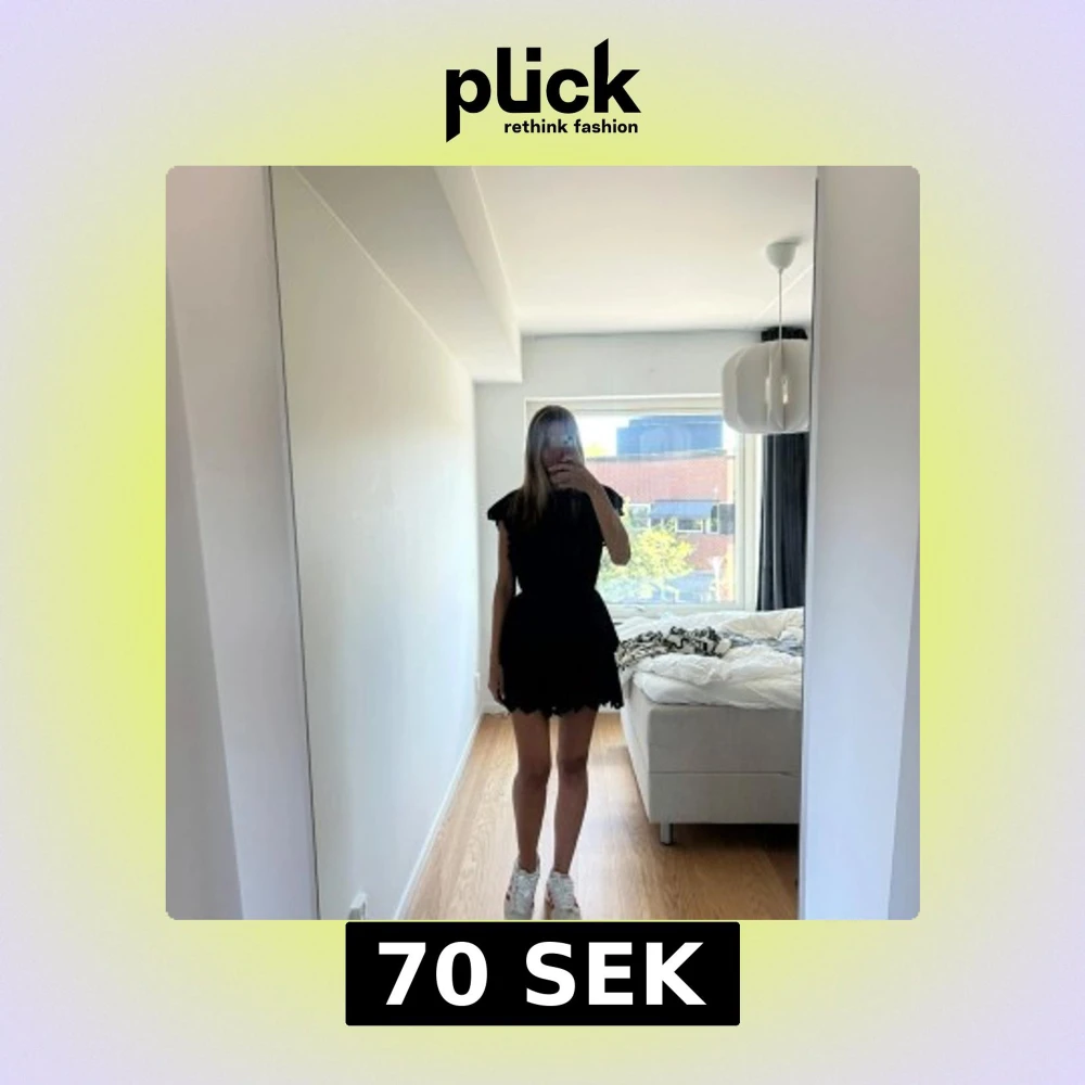 Supersöt svart kort klänning från H&M Divided med broderade volangdetaljer och blommiga utskärningar. Klänningen har ärmlös design med volanger och markerad midja. Perfekt för dig som gillar en feminin och trendig look.