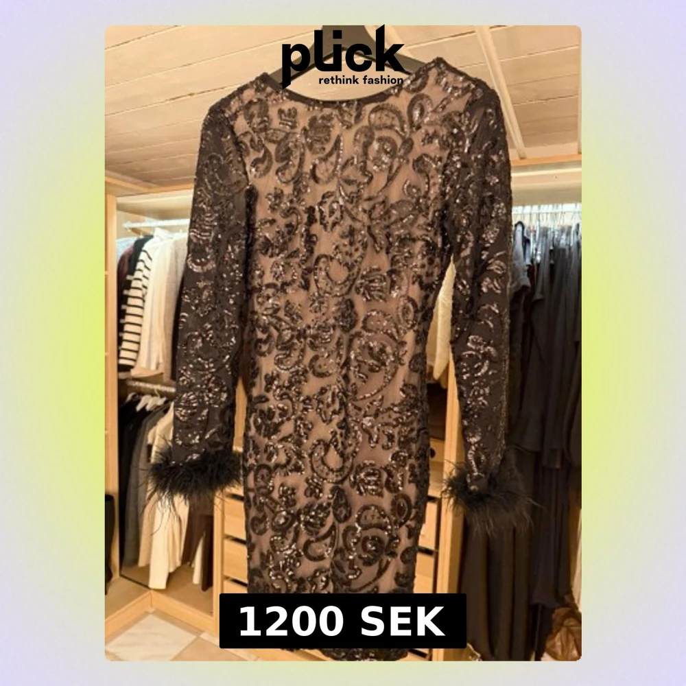 Säljer en superfin svart kortklänning med glittriga paljetter och broderat mönster. Klänningen har långärmade ärmar med fjäderdetaljer vid ärmsluten och en djup v-ringning i ryggen. Normal i storlek o endast provad.