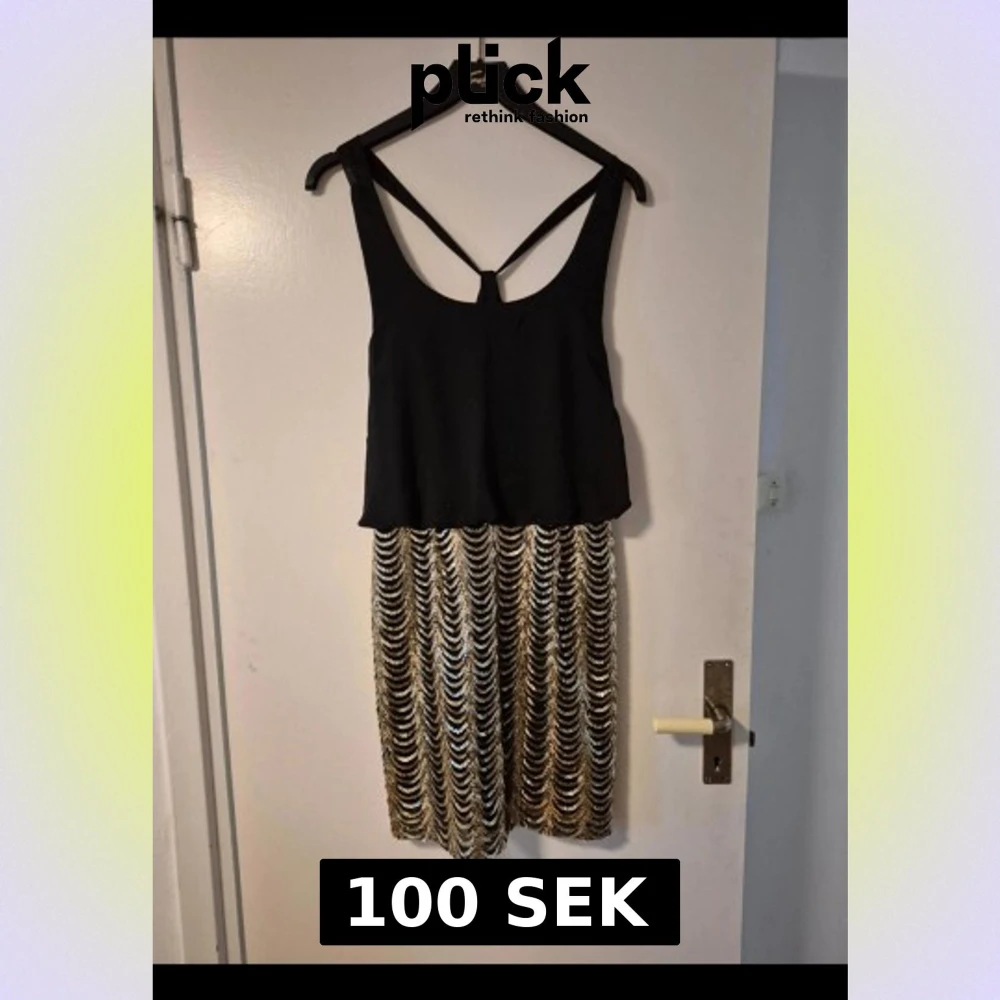 Supersnygg kort klänning med svart överdel och glittrig kjol i guld paljetter. Kjolen har ett vågigt mönster och överdelen har breda axelband med snygg ryggdetalj. Perfekt för dig som vill sticka ut med en festlig look.