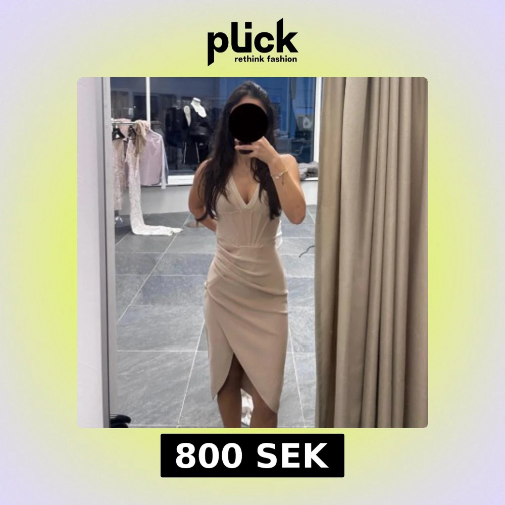 Säljer en beige klänning med omlottkjol och v-ringad hals. Klänningen har breda axelband och figurnära passform som framhäver midjan. Kjolen har snygga draperingar och slits framtill. Finns i alla storlekar XS-XL. Pris går att diskutera.