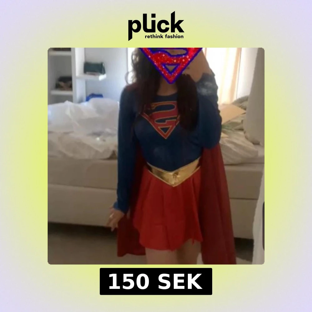 Supergirl-inspirerad klänning med blå överdel, rött S-emblem, långärmad design och röd kjol. Guldigt bälte i midjan och matchande röd cape. Perfekt för cosplay eller maskerad, riktigt ikonisk look!