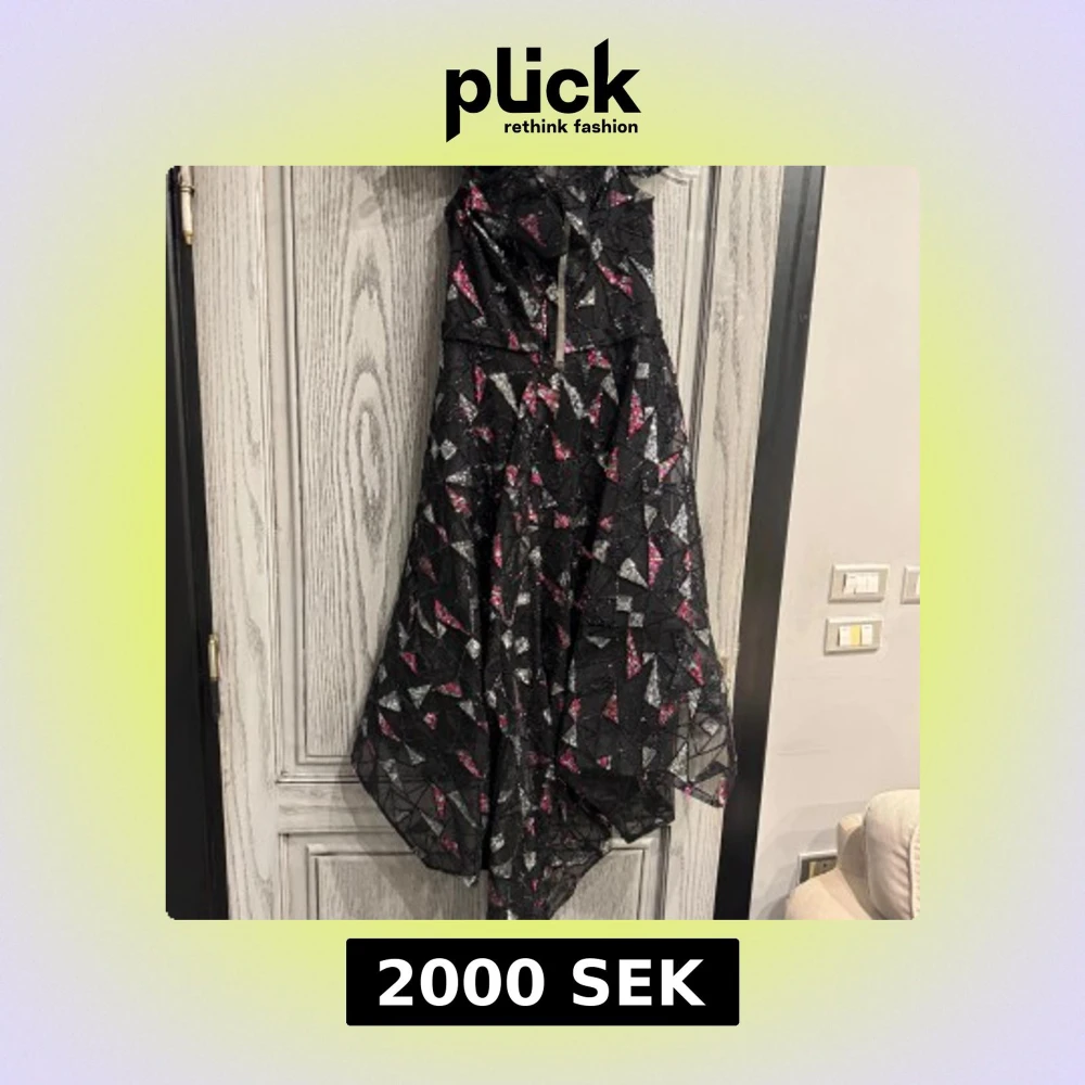 Unik svart långklänning med glittriga silver- och rosa detaljer i geometriskt mönster. Klänningen har en asymmetrisk fåll, dekorativ blomdetalj vid axeln och ett stort glittrigt spänne i midjan. Perfekt för dig som vill sticka ut.
