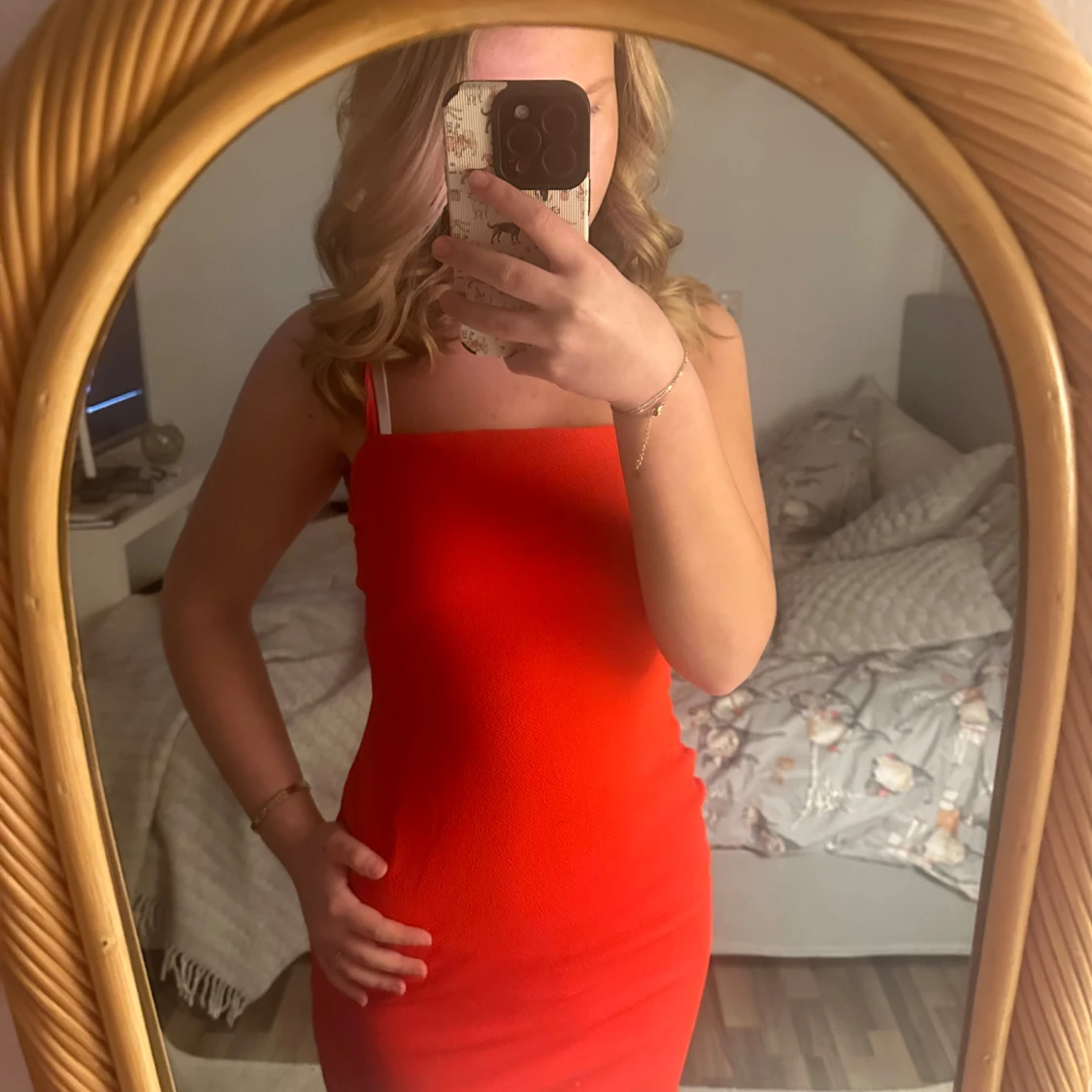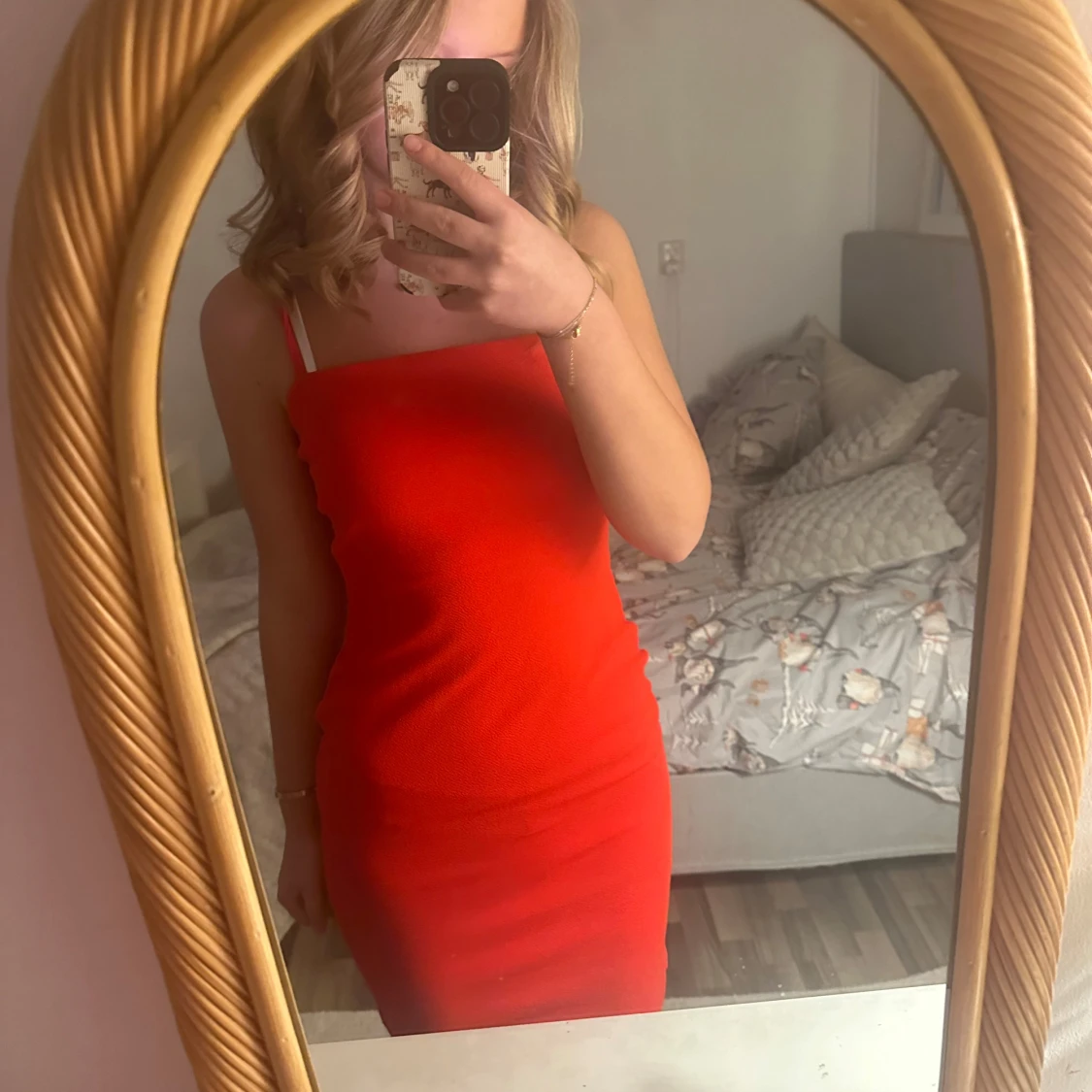 Snygg röd axelbandslös klänning med tight passform. Perfekt för en kväll ute eller en speciell tillställning. Klänningen har en enkel och stilren design som framhäver figuren.