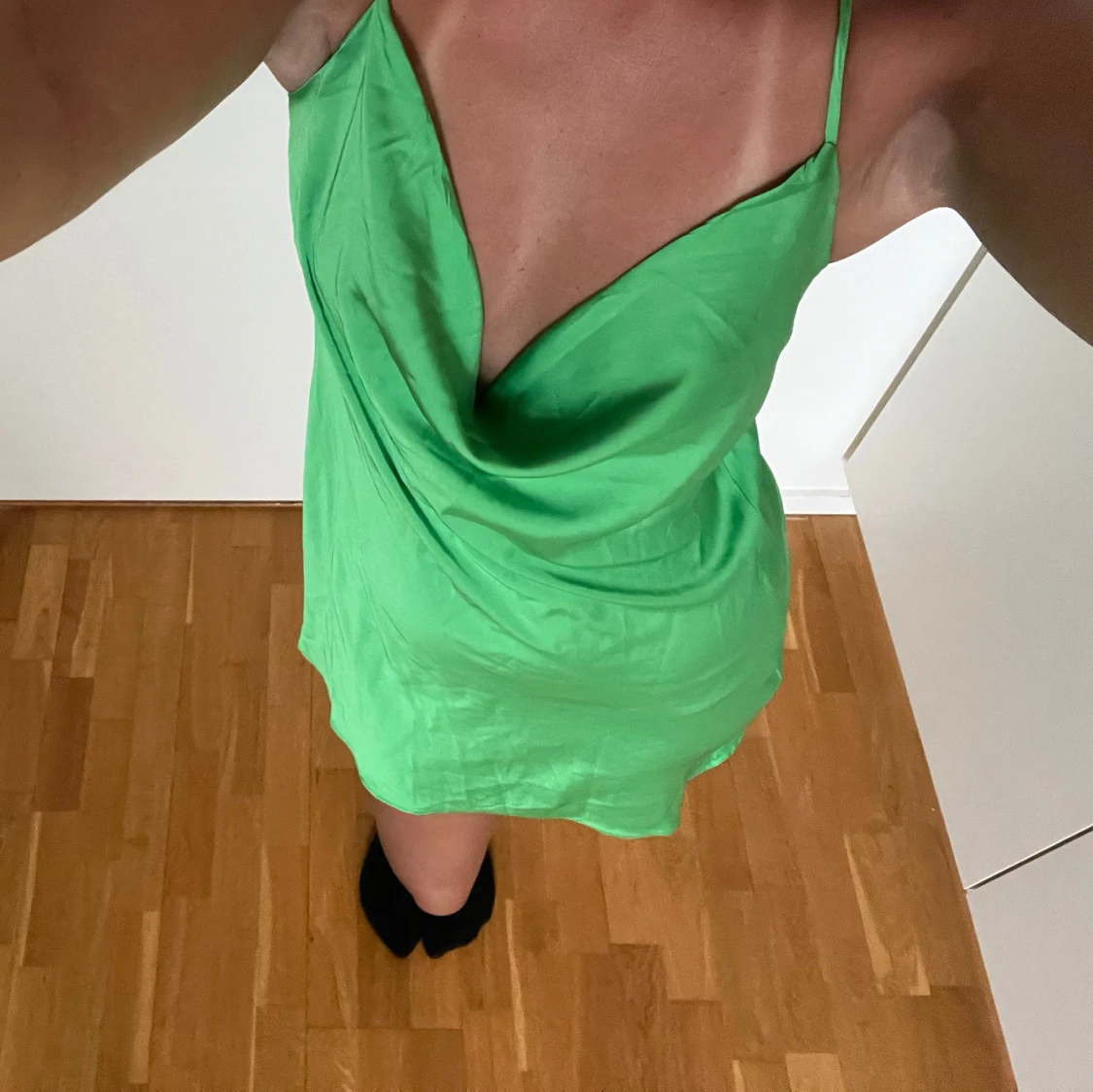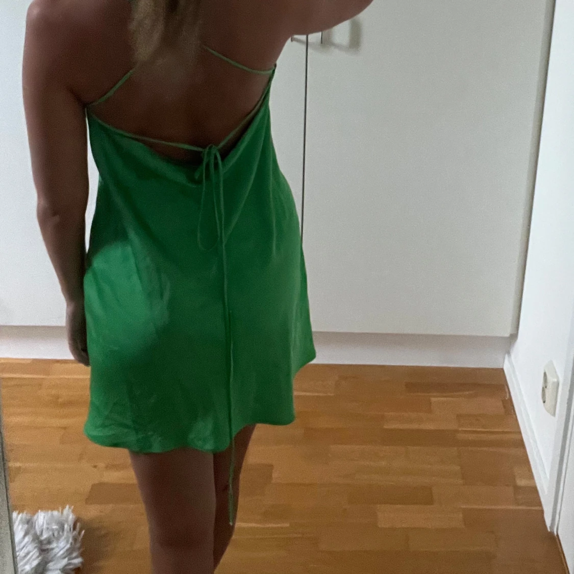 Snygg grön kort satin klänning med tunna axelband, öppen rygg.