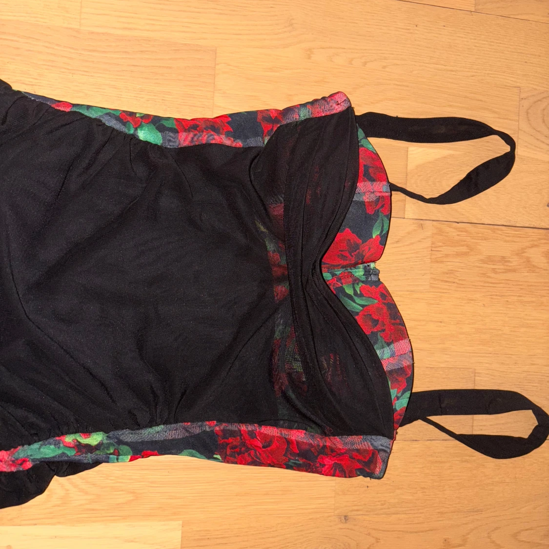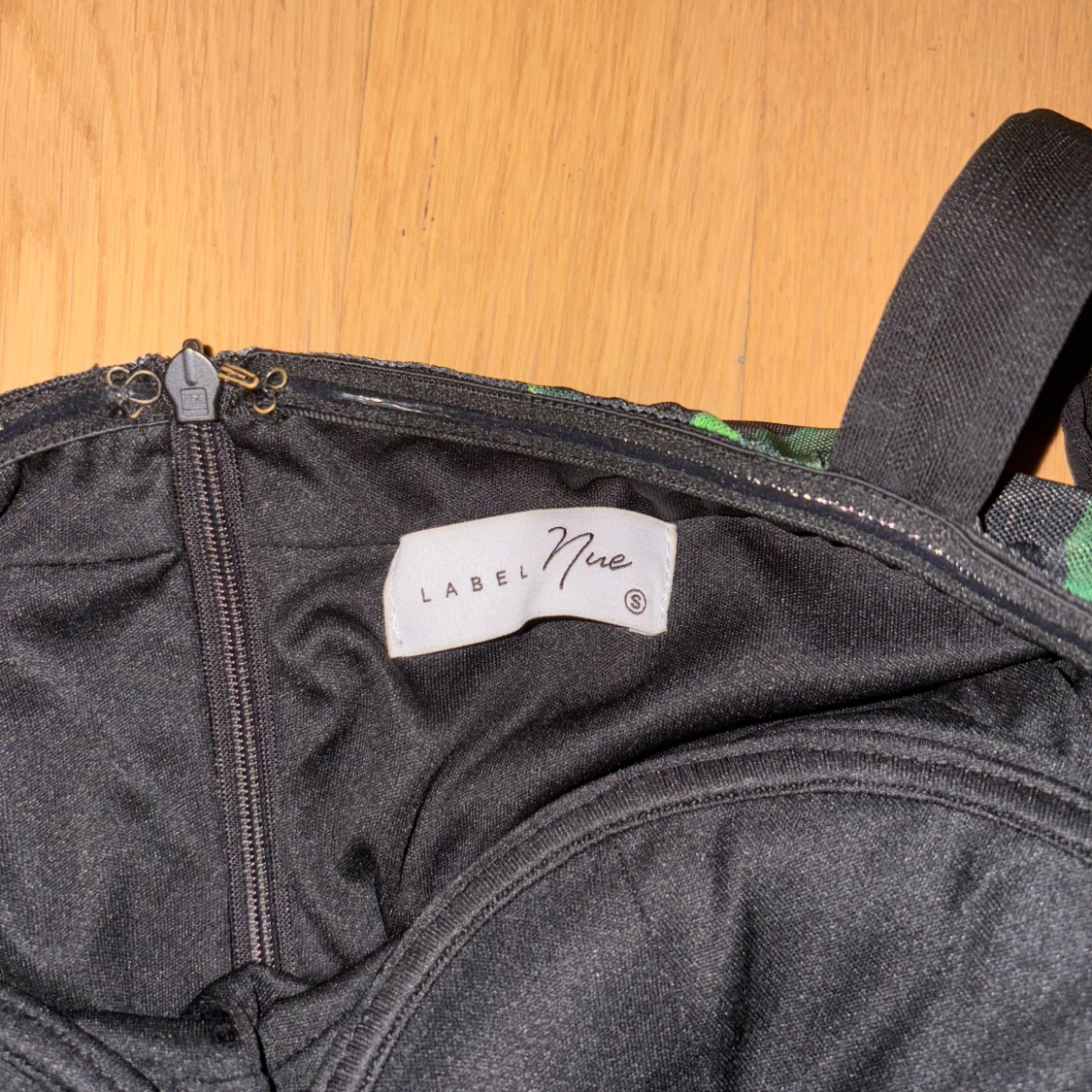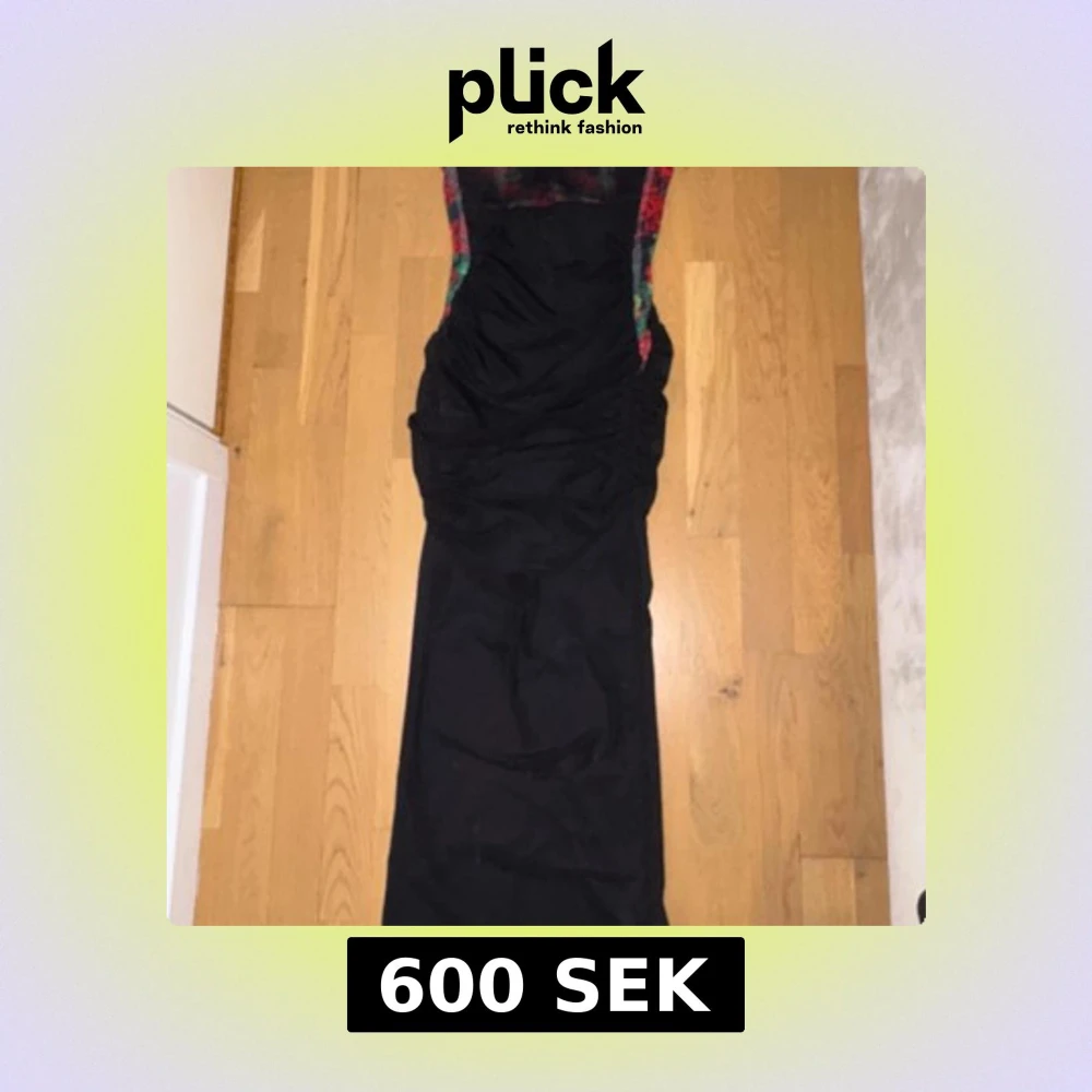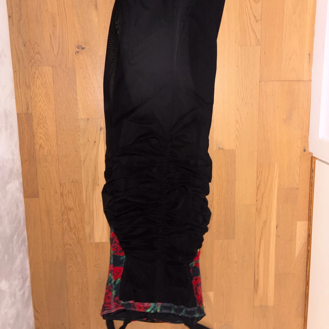 Supersnygg svart långklänning från Label Nue i storlek S. Klänningen har smala axelband och coola blommiga detaljer i rött och grönt längs sidorna och upptill. Den är figurnära med rynkade partier och dragkedja i ryggen. Perfekt för dig som vill sticka ut med en unik look!