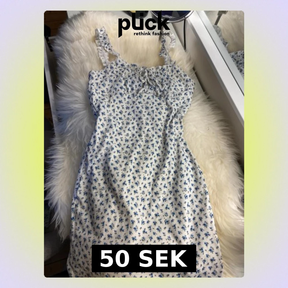 Supersöt vit kortklänning med blått blommönster och volangdetaljer på axelbanden. Klänningen har snörning framtill och är gjord i ett mjukt bomullstyg. Perfekt för varma dagar och ger en romantisk vibe.