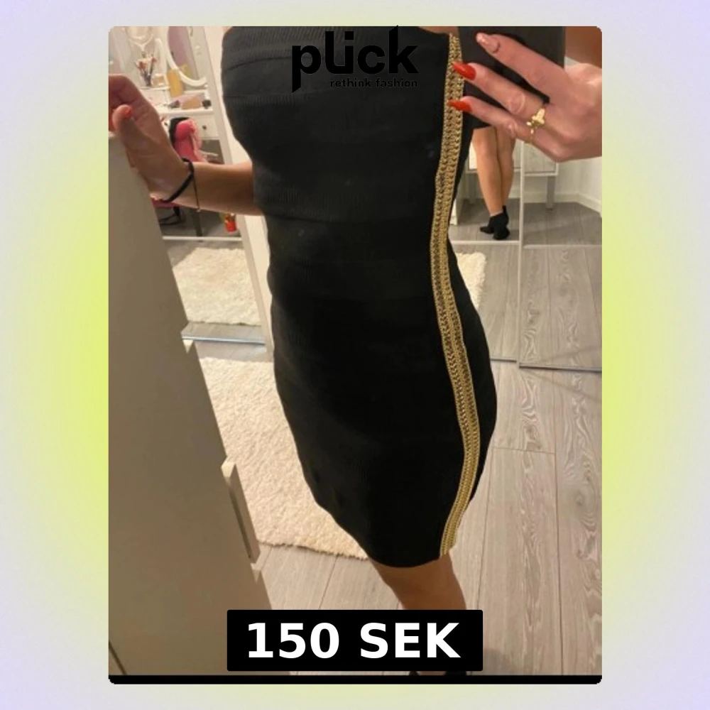 Helt ny Snygg svart axelbandslös klänning med guldiga detaljer längs sidan. Tight passform och kort modell som framhäver figuren. Perfekt för dig som vill sticka ut med en elegant men edgy look.