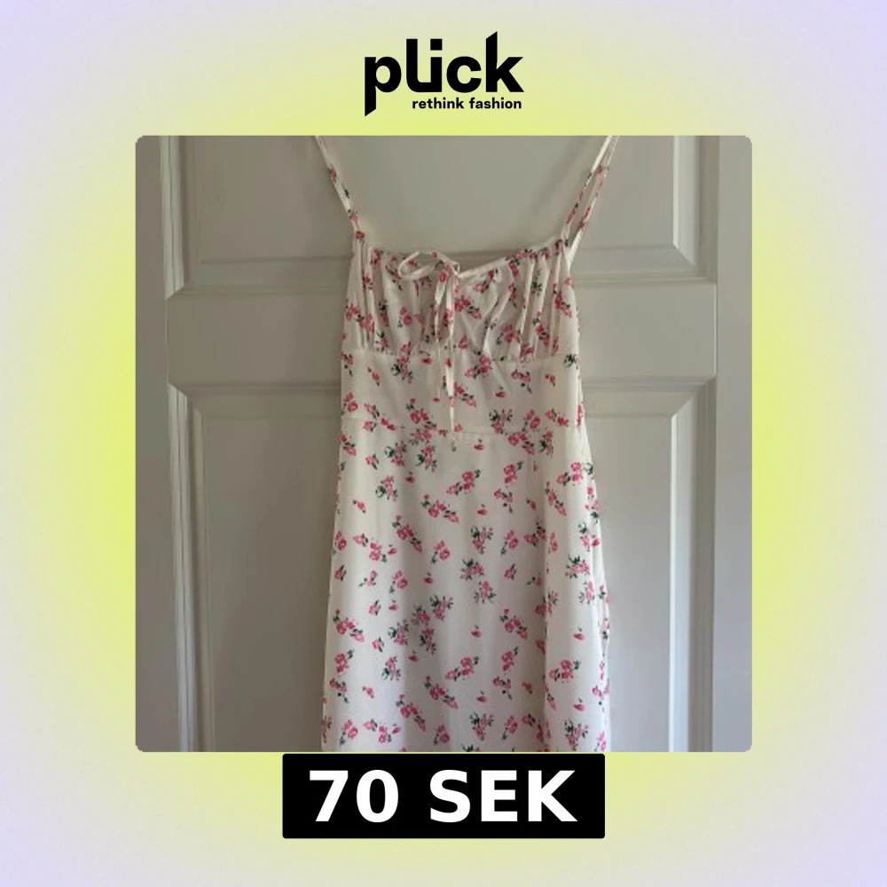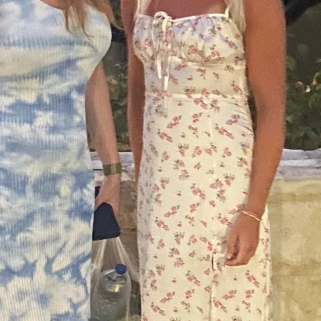 Supersöt långklänning i vit med små rosa blommor och gröna blad. Klänningen har smala axelband, snörning framtill och en lätt, flowy passform. Perfekt för varma dagar och ger en romantisk vibe. Materialet känns svalt och mjukt mot huden.