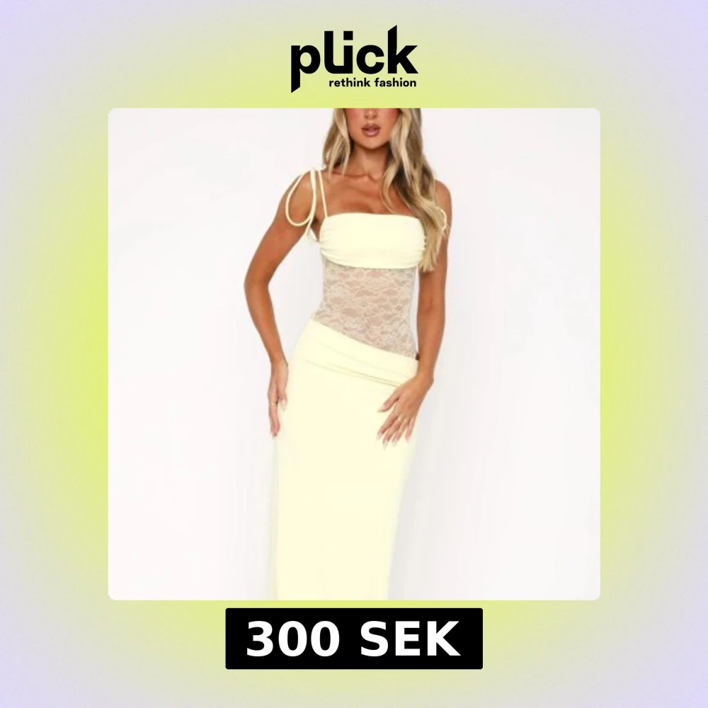 Säljer en ljusgul långklänning med smala axelband och transparent spets i midjan. Klänningen har figurnära passform och dubbla axelband som knyts på axlarna. Köpt tidigare på plick men tyvärr för stor ( pris kan diskuteras!)💕