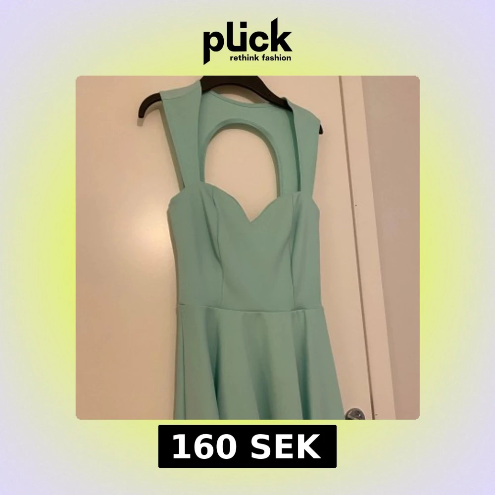 Säljer en mintgrön klänning med hjärtformad urringning och öppen rygg. Klänningen har breda axelband och en utsvängd kjol som ger en feminin siluett. Perfekt för vårens och sommarens tillfällen!