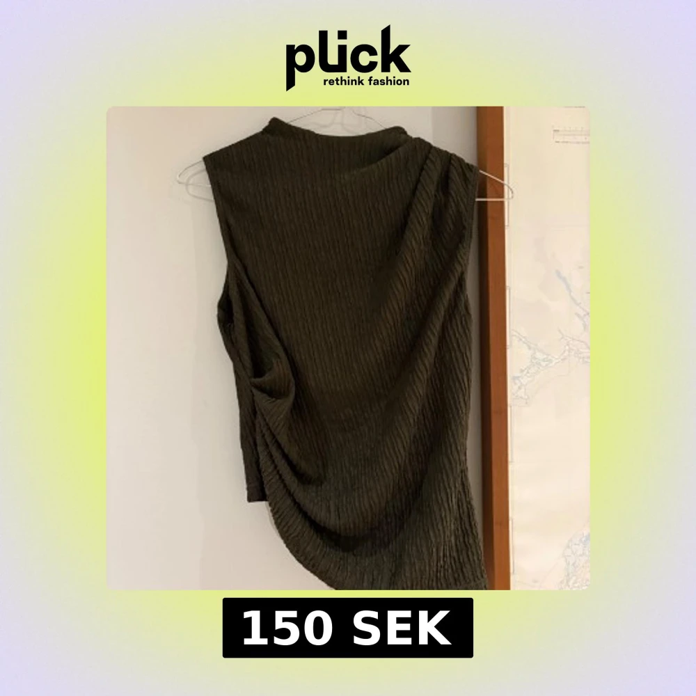 Säljer en mörkgrön ärmlös topp med omlott-detalj och snyggt strukturerat tyg. Toppen har hög hals och dragkedja bak, samt en asymmetrisk nederkant som ger en cool look. Perfekt för dig som gillar stilrena och unika plagg.