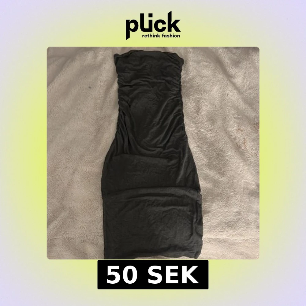 Säljer en mörk grå axelbandslös klänning med tight passform. Tror att de är storlek S men inte säker
