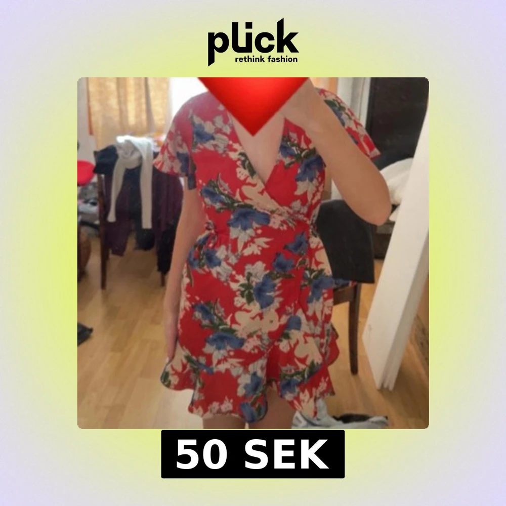 Superfin röd kort omlottklänning med blommigt mönster i blått, grönt och beige. Klänningen har volangdetaljer nertill och vid ärmarna, v-ringning och korta ärmar. Perfekt för sommarens alla tillfällen!